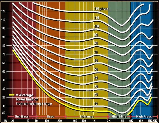 위의 그래프의 가장 아래선이 노란색은 사람들의 평균적으로 소리를 인지 즉 소리를 듣기 시작하는 선이다. 왼쪽 아래의 20Hz를 보면 노란색의 시작이 70dB중반에서 시작된다. 이것이 의미하는 것은 사람은 20Hz를 75dB정도의 크기가 되어야지 소리로 인식 즉 들리기 시작한다는 말이다. 귀가 먹어서 그런것이 아니라 우리의 뇌가 이렇게 반응하기 때문이다. 20Hz는 약 75dB의 크기로 틀어줘야 '아 들립니다'라고 상대방이 대답할 것이다. 다른 말로 가청주파수중 가장 낮은 20Hz를 듣기 위해서는 스피커가 상당한 크기로 재생되어야만 한다는 것이다. 초저음을 재생할 수 있는 스피커는 그 크기와 출력이 상당하여야한다. 스피커의 크기와 재생되는 소리의 크기로 인해 홈레코딩에서는 적당하지 못하다.