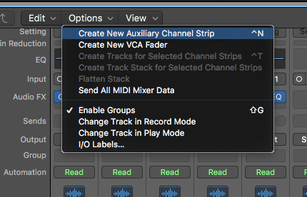 1. AUX 트랙을 만든다. AUX트랙은 로직의 경우 믹서 윈도우에서 만들수 있다.