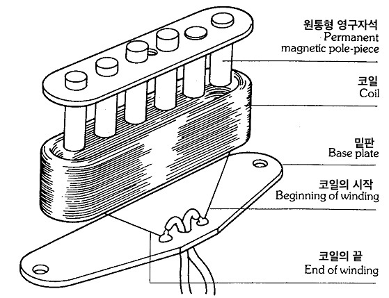 밑판과 윗판에 원통형 자석을 설치하여 자기장을 형성하고 이 주위에 구리 코일을 감아 코일의 양쪽끝을 연결한다. 기타의 금속줄이 자기장위에서 흔들리면 이로 인해 유도전기가 만들어지고 이렇게 만들어진 전기는 코일의 양쪽끝을 통해서 출력된다. 이 때 출력되는 전기량에 영향을 미치는 요소는 자석의 강도, 코일의 굵기와 길이이다. 출력되는 전기량에 영향을 미친다는 뜻은 음색에도 영향을 미친다는 이야기이기도 하다. 마그네틱 픽업에 관해서는 차후 일렉트릭기타 녹음에서 보다 자세히 다루도록 하겠다.