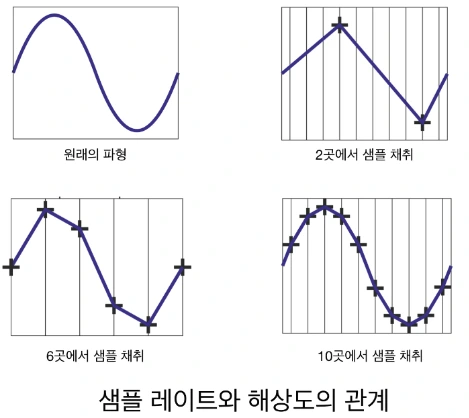 정답은 2번이다. 강함이 일어날때 한번, 약함이 일어날때 한번 파악하면 된다. 그럼 초당 진동횟수를 알 수 있다. 소리도 진동이다. 들리는 소리의 진동횟수를 알기 위해서는 그 소리를 최소한 2번 파악하면 된다. 다른 말로 하자면, 들리는 소리의 진동횟수의 두배로 파악해야 그 소리의 진동횟수를 알 수 있다는 말이다. 아날로그, 전기신호를 디지털로 변환하는 과정도 이와 같다. 입력되는 전기신호의 진동수의 두배로 파악해야 입력신호의 진동횟수를 파악할 수 있다. 물론 두배 이상을 하게되면 더욱더 확실하게 입력전기신호의 진동수를 알 수 있게 될 것이다.