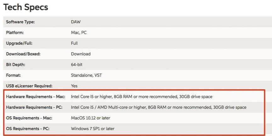 프로그램들마다 요구되는 컴퓨터 사양을 체크하고 업데이트시 꼭 참조하여야 한다. 위의 그림은 CUBASE PRO X 의 컴퓨터 요구사양이다. 대부분의 경우 시스템 요구사항에 나와있는 조건들은 컴퓨터의 최소사양을 말한다. PC의 경우 CPU는 Intel Core i5 혹은 AMD Multi-core 혹은 그 이상, 메모리는 8GB이상, 하드드라이브는 30GB 이상의 여유공간이 요구되지만 이는 최소요구사항으로 프로그램을 최상의 컨디션으로 활용하기 위해서는 휠씬 더 높은 사양을 요구한다.