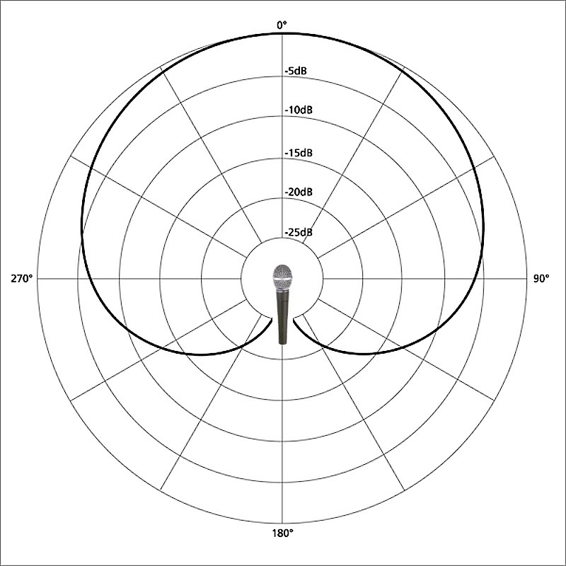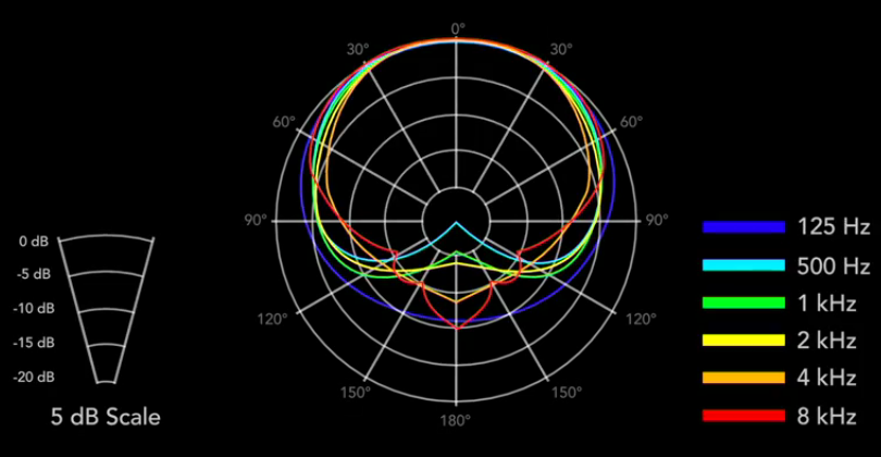 <- 단일지향성(카디오이드)을 나타내는 폴라패턴이다. 마이크가 바라보는 각도에서는 음압의 손실이 없지만 다른 각도에서는 음압의 변화가 생기는 것을 알수 있다. 하지만 이 음압의 차이는 주파수에 따라 조금씩 다르게 나타난다.