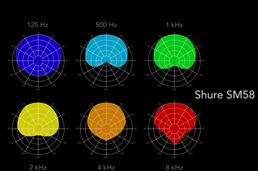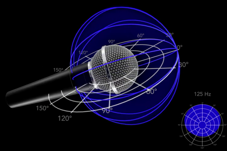 위의 그림을 보면 각각의 주파수에 따라 모양이 조금씩 다른것을 알고 있다. 실제로 단일지향성을 나타내는 주파수는 대략 500~2000Hz 정도이다. 그러므로 주파수의 변화에 따라 지향각이 조금씩 달라진다는 것을 인지하는 것이 좋을 것이다. 하지만 이 그림도 완전하지 않은 것은 이렇게 이차원적인 평면이 아니라 소리는 삼차원적 즉 입체적으로 마이크로 접근한다는 점이다. 다음의 그림은 마이크가 어떤 모양으로 혹은 입체적으로 소리를 받아들이는지 보여준다.