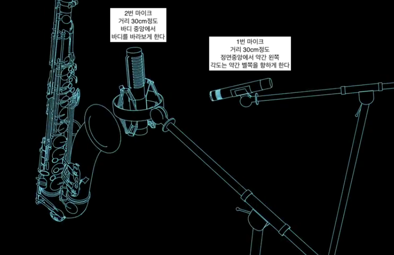1. 마이크의 위치는 색소폰 키들의 중간지점에 마이크를 위치시키고 거리는 약 30cm 정도로 하자.
