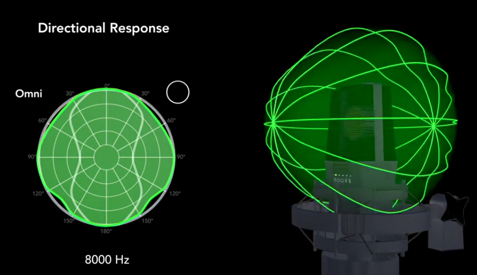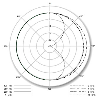 왼쪽 그림은 '노이먼'사의 U-87이라는 마이크를 무지향성으로 설정해 놓았을때 나타나는 주파수별 지향성의 변화를 보여주고 있다. 설명하자면 125~1,000Hz 까지 즉 왼쪽 반원은 완벽한 무지향성 특징을 그대로 나타낸다. 오른쪽 반원의 가장 바깥쪽 테투리 2kHz 까지는 무지향성을 아주 성실히 나타내고 있다. 이이갸기는 U-87의 무지향성 패턴은 20~2,000Hz까지는 거의 완벽하게 무지향성이라는 것이다. 4~6kHz에서는 살짝 약한 반응으로 보이다 16,000Hz가 되면 지향성의 패턴이 극단적으로 변하게 된다.