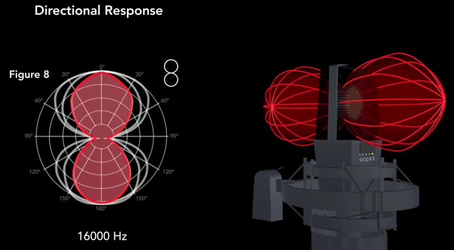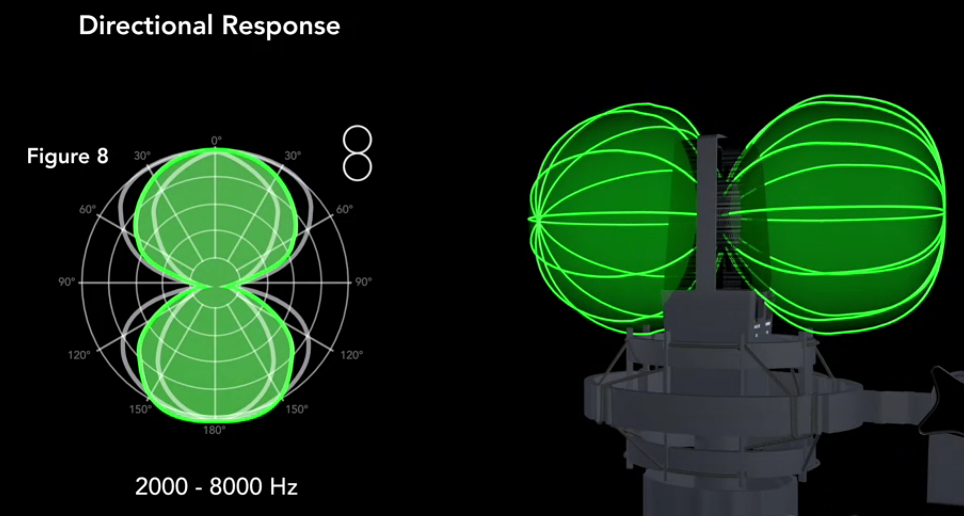 다시 한번 이야기하는 것은 위의 오른쪽 그림이 묘사하는 것처럼 앞면과 뒷면에서 오는 소리는 리본을 흔들어 전기를 만들어 내지만 옆면에서 오는 소리는 양면에서 동시에 리본에 도착하게 됨으로 리본이 흔들리지 못하게 됨으로 전기가 만들어 지지 못하는 것을 묘사하고 있다. 다음 그림은 주파수별 지향각의 변화를 설명하는데 약간의 각도를 제외하면 양지향성 8자형 지향각은 거의 변화하지 않는것을 알수있다.