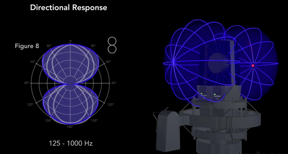 다음으로는 양지향성 마이크이다. 영어로는 바이디렉셔널 혹은 피규얼8(Figure 8, 8자형)이라 불린다. 양지향성 마이크는 양쪽에서 소리를 받아들이고 옆쪽 즉 90도 지점에서는 오는 소리는 거의 받아 들이지 못한다. 그 이유는 양쪽에서 오는 소리가 같은 압력으로 진동판을 누르게 되면 진동판이 흔들릴 수 없기 때문이다. 이 양지향성을 물리적으로 가장 잘 보여주는 것이 바로 리본 마이크이다. 리본 마이크는 그 구조상 양지향성 패턴을 가진다.
