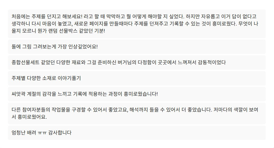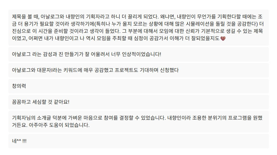 프로젝트를 진행하는 과정에서 기록되었기에 정리되지 않은 부분들이 많았지만 그럼에도 날 것의 좌충우돌이 담겨 있어 개인적으로는 아카이빙 그 이상의 의미가 있다.