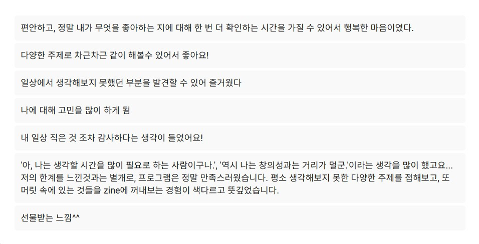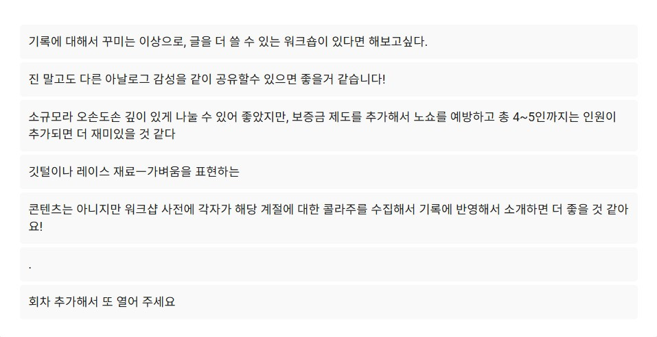 쉬는 시간도 사양하고 3시간을 달린 참여자들인데, 하나같이 짧게 느껴진다 말을 하니.. 감사한 일이다.