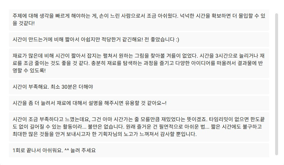 ※ 재미있는 사실은 한결같이 시간이 부족하다는 의견이 나온다는 것이다.