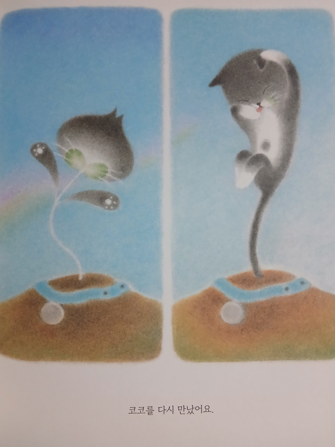 주인공 아이는 코코에게 근사한 캣타워를 내미는 게 아니라 함께 뒷산에 오르고, 요즘 잘 나가는 츄르를 건네는 것이 아니라 집에서 늘 먹던 대로 식사를 한다. 물론 아이이기 때문에 제한될 수밖에 없는 상황이겠지만, 상상 속인데 마음만 먹으면 못하리란 법도 없다.