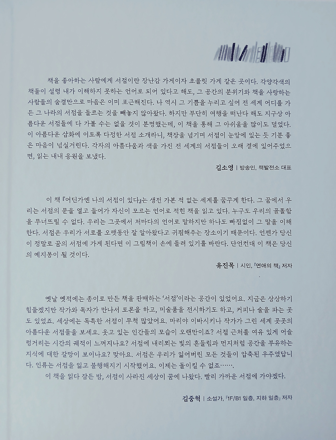 토씨 하나를 바꿔서 '어딘가에 나의 서점이 있다.'거나 '어딘가 나의 서점이 있다.'고 했을 땐 느껴지지 않는, 부드럽지만 단단한 바탕이 자리한다. 그 이유를 똑똑히 따져 보일 순 없지만, 희망을 노란색 · 초록색 풍선처럼 기분 좋게 그러잡고 있는 문장 같다.