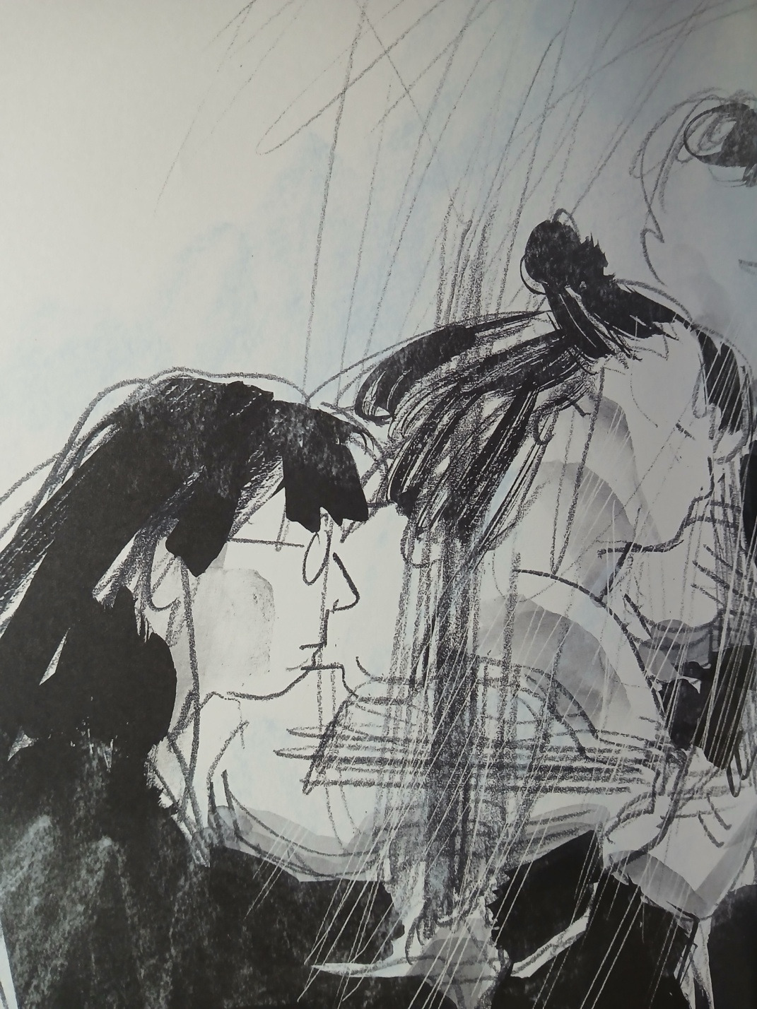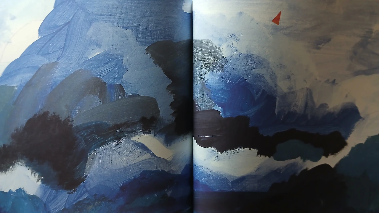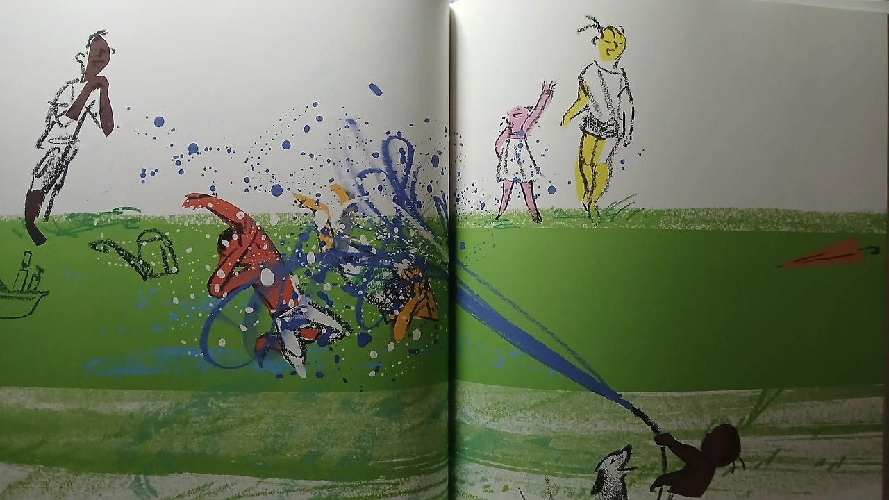 여름의 한복판에서 신나게 물놀이를 즐기던 아이들 앞으로 바람이 몰아치고 비가 퍼붓는다. 아이들은 비바람 속에서도 마냥 즐겁다. 그때 들고 있던 주황색 우산이 <오즈의 마법사> 속 도로시처럼 회오리바람에 휩쓸려 날아간다. 작가는 상당 부분을 할애해 우산의 여정을 보여주는데, 비바람 속에서 먹구름 속에서 홀로 유영하는 우산의 비행을 따라가는 게 뜻밖에도 즐겁다.