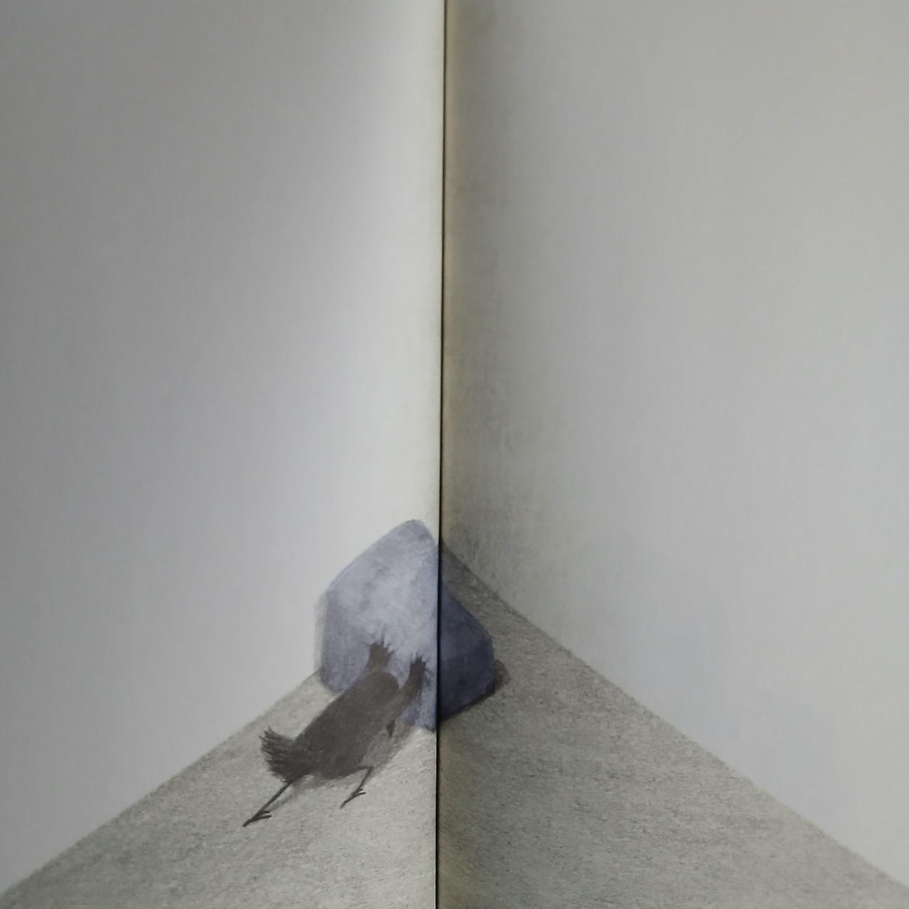 처음에 아무것도 없는 구석에서 까마귀가 쪼그려 앉아 있거나 물구나무서 있는 모습이 책 틈으로 인해 제대로 보이지 않는다는 점이다. 책의 양 날개를 바짝 당기지 않으면 까마귀의 모습을 제대로 감상할 수가 없다.