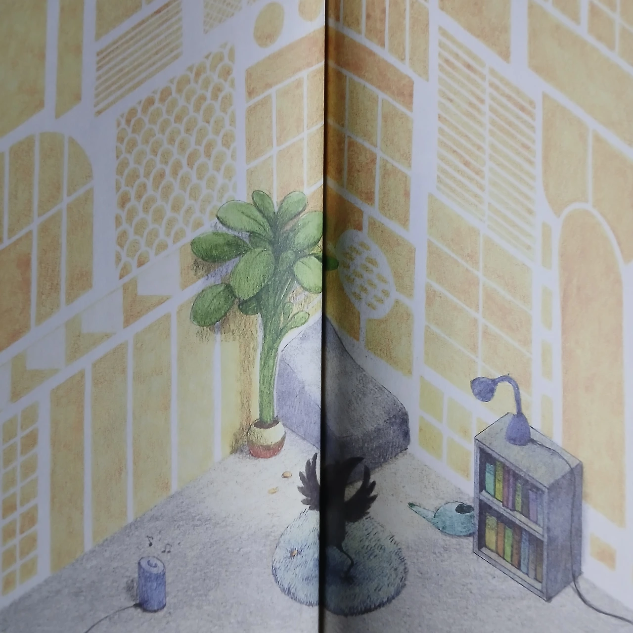 까마귀는 샛노란 크레용으로 벽을 정성스레 칠하기 시작한다. 노동요까지 틀어놓고 다양한 무늬를 벽에 아로새긴다. 어느덧 벽은 까마귀가 입힌 색으로 가득하다.