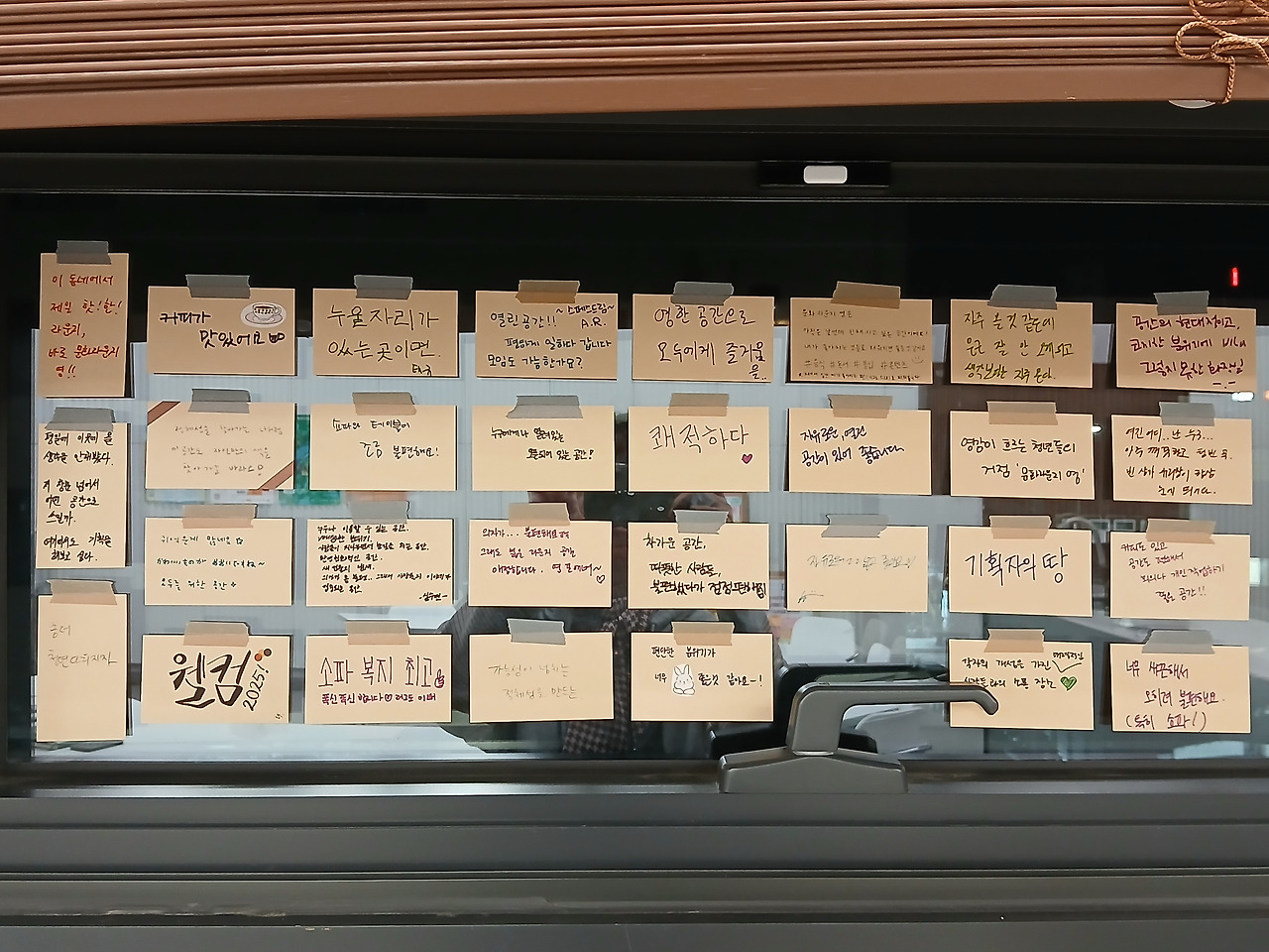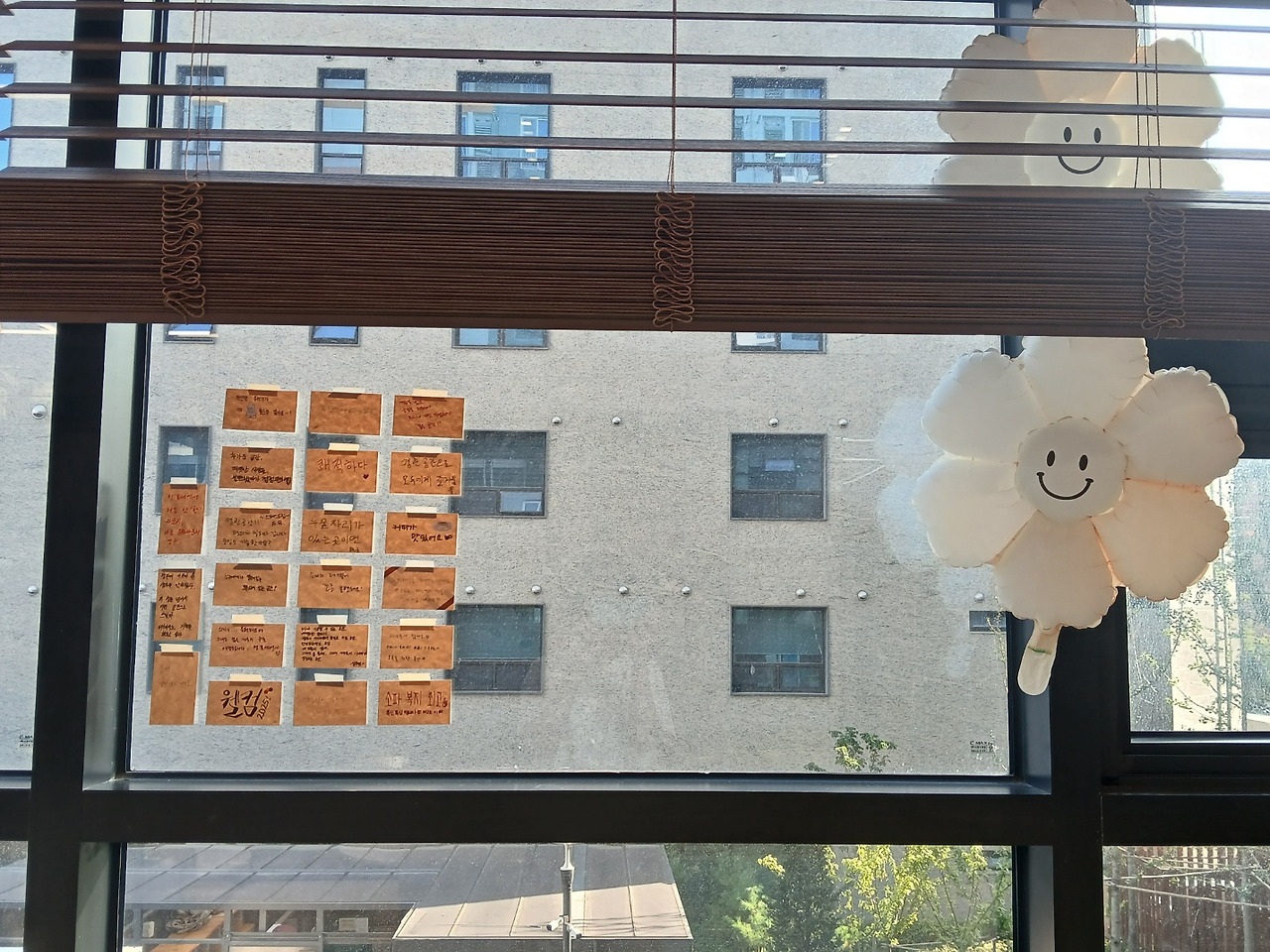다른 작업물들과 떨어져 있는 것도 그렇지만, 생각보다 웰컴 카드(→카드의 원 이름이다..ㅎ)의 수가 많지 않은데 비해서 창문은 너무 넓어 휑한 느낌이 컸다. 그나마 오픈 행사 때 붙여놓은 듯한 풍선이 있어서 조금은 덜 외로운 듯한..