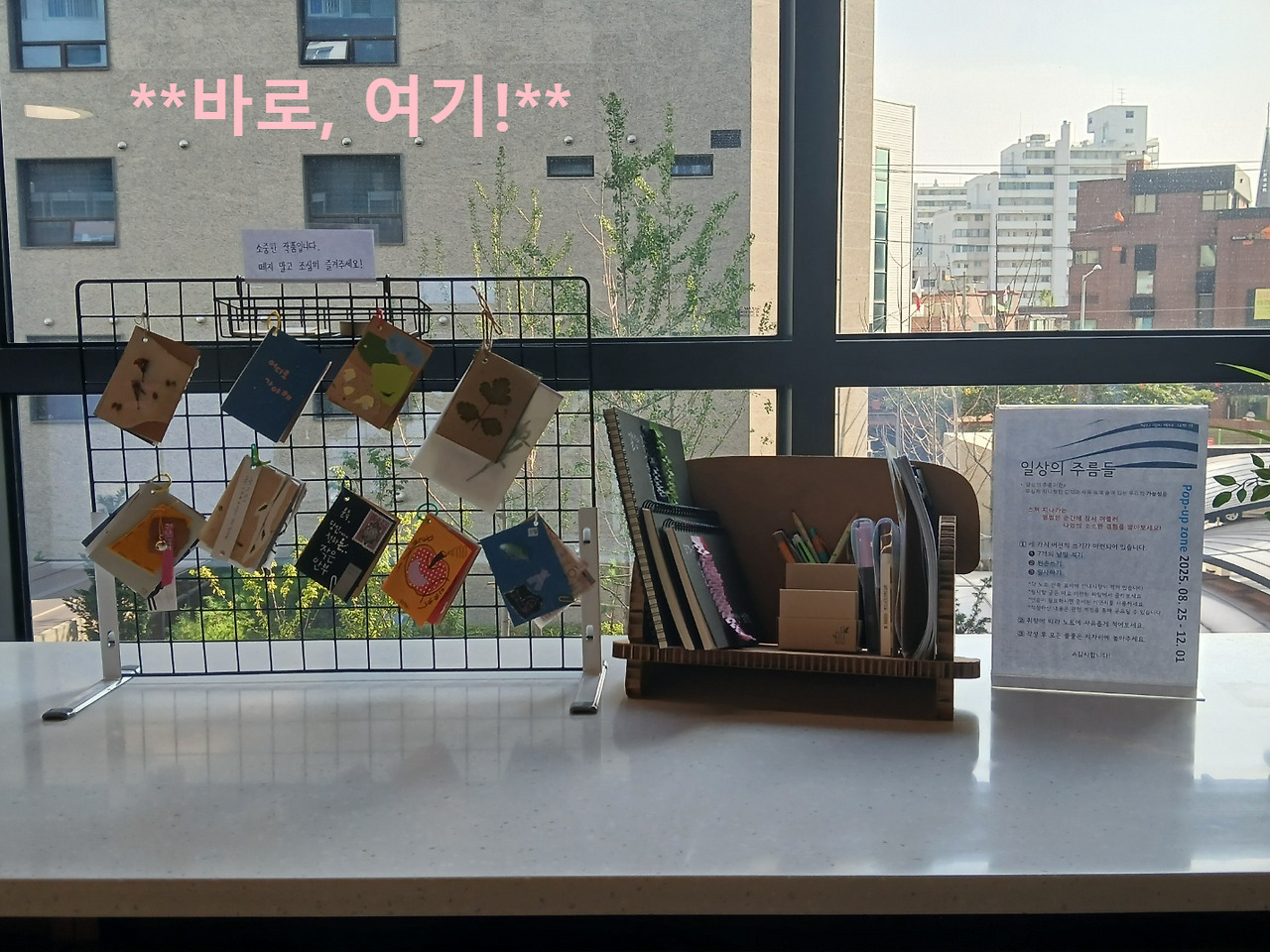 처음 생각했던 자리는 신풍 노트와 신풍 탁자의 작업물들 뒷면에 위치한 유리창이었다. (사진 참조)