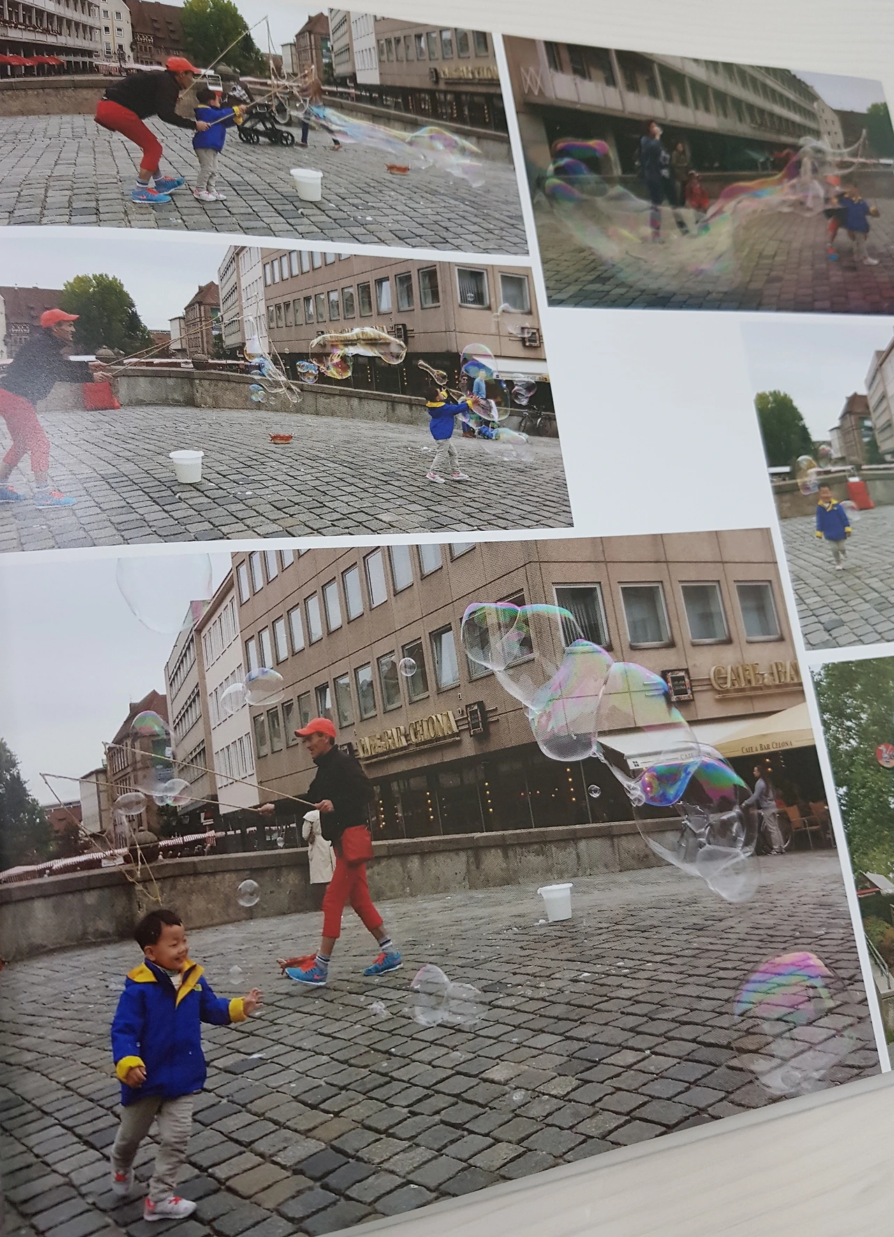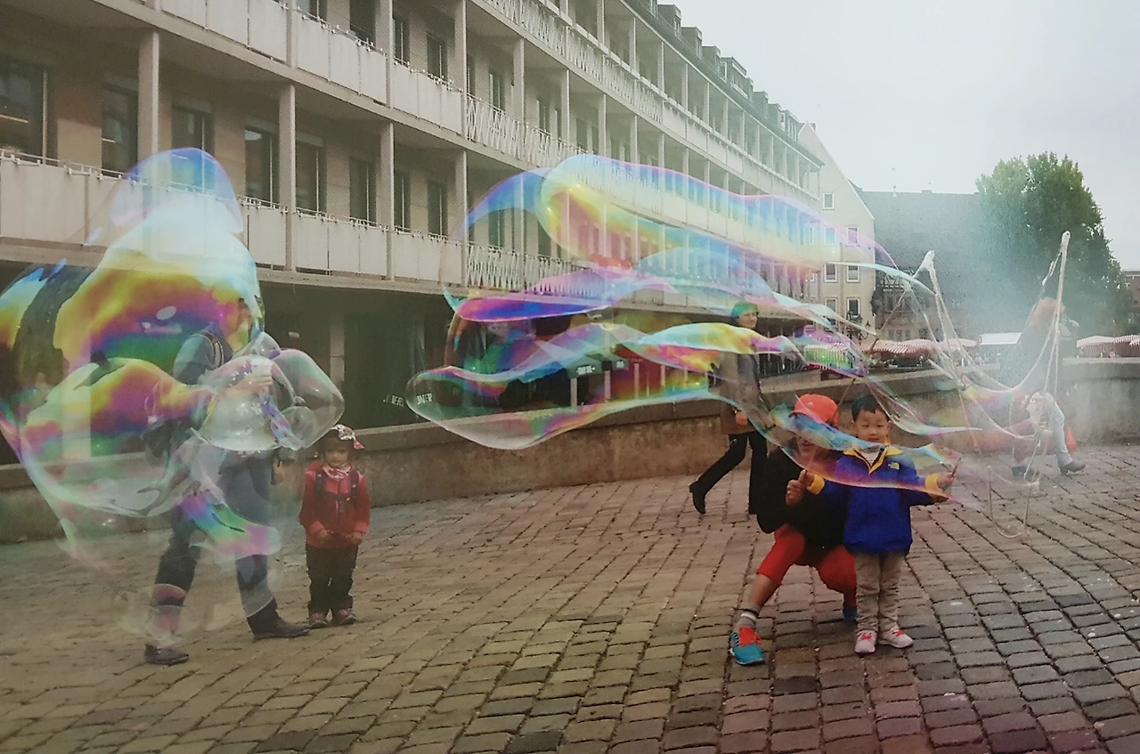 밑으로 작은 천이 흐르는 다리 위에서 생각지도 못한 쇼가 펼쳐졌다. 규모가 큰 키즈카페나 마술쇼에서 보던 비눗방울 퍼포먼스와 비할 수 없을 정도로 스케일이 컸다. 도구들을 챙겨 자리 잡는 모습부터 지켜보고 있었던지라 곧바로 발탁?되어 비눗방울을 체험할 수 있었다. 의외로 주변이 한산해서 꼬마고객이라고 해봐야 내 아이와 사진 속 여자아이뿐이었다. 왜 이렇게 한적한 곳에 자리를 펴셨지? 어른들만 바삐 다니는 길목이잖아? 시작한 지 얼마 안 돼서 사람이 없었나? 뭐지?