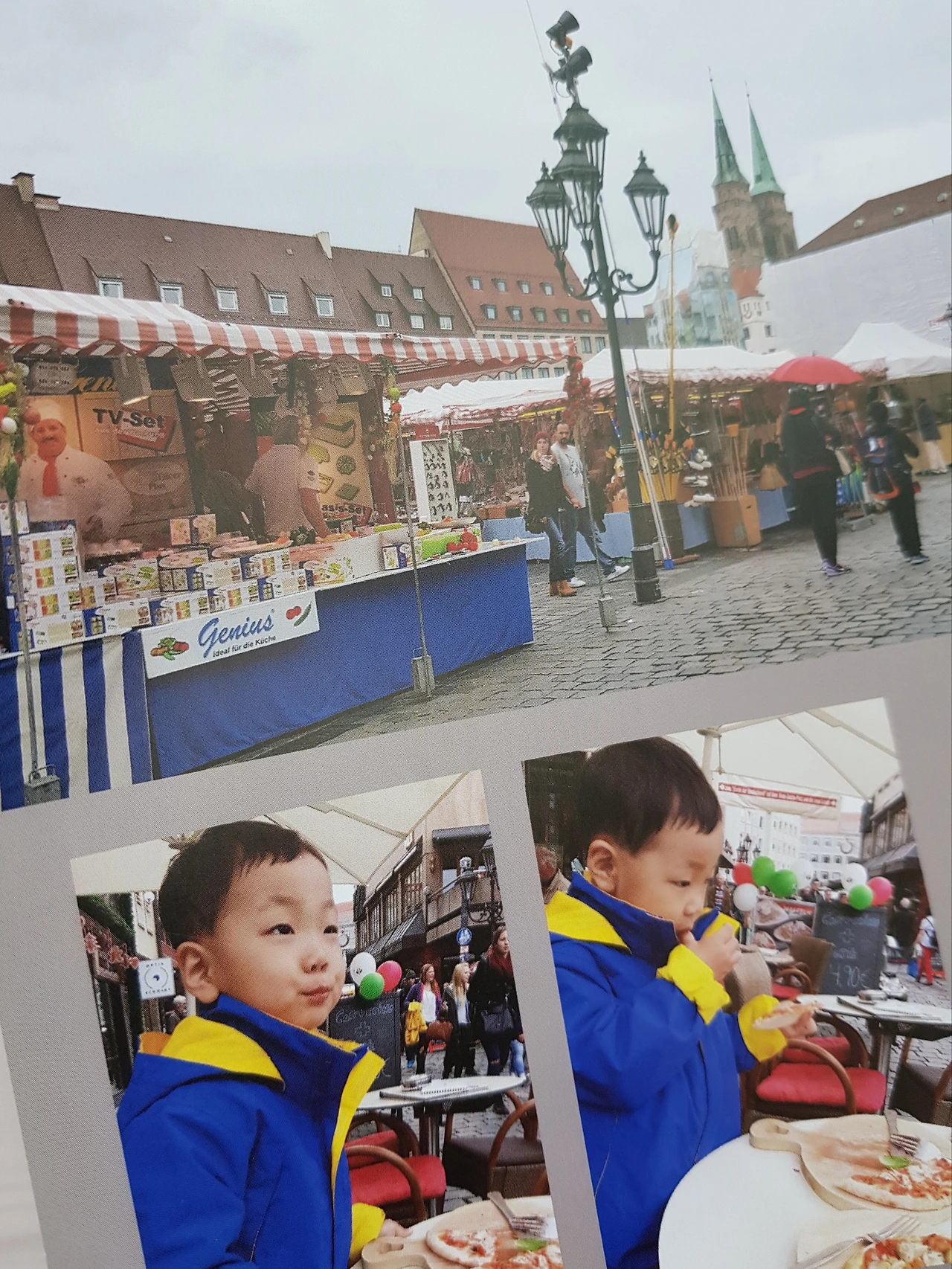 오늘은 다른 도시로의 이동이 없는 날이라 점심시간에 맞춰 느긋한 식사가 가능했다. 마켓이 펼쳐진 마르크트 광장의 이모저모를 1등석에서 관람할 수 있는 카페 테라스에 자리를 잡았다. 앞서 뉘른베르크 추천 음식을 경험했으니 이번엔 '잘 아는 맛'으로 가자! 네 살이 되었어도 밥숟갈을 스스로 뜨지 않는 아이가 음식에 적극적인 모습이 낯선데 반갑다. 이색적인 분위기에서의 익숙한 한 끼는 나에게도 만족을 주었다.