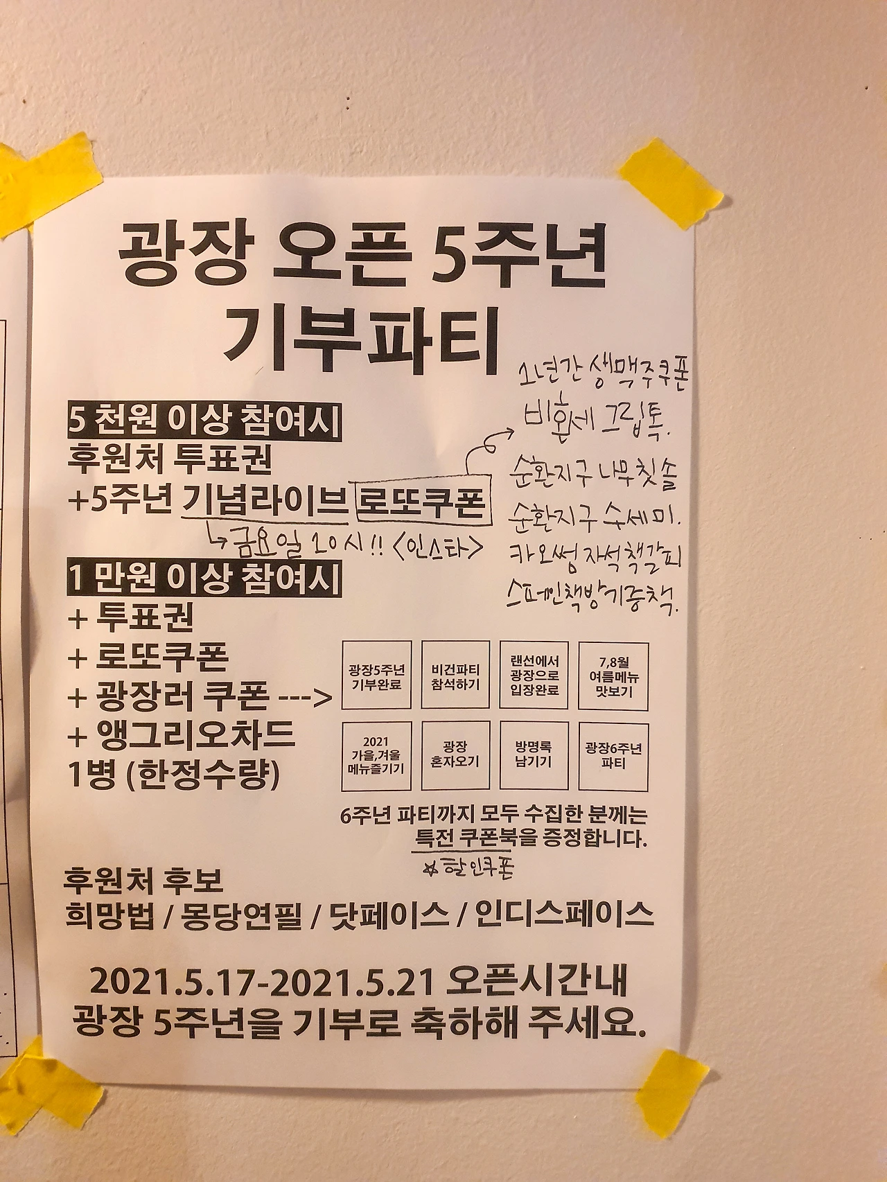 <광장>을 알게 된 건 2019년 11월, 두 번째 퇴사 후 한 달이 지났을 무렵이었다. 사장님이 쓰신 책 <밥 먹는 술집을 차렸습니다>를 도서관에서 우연히 읽기 시작해 이틀 만에 완독하고 <광장>에도 직접 가본 것이다.