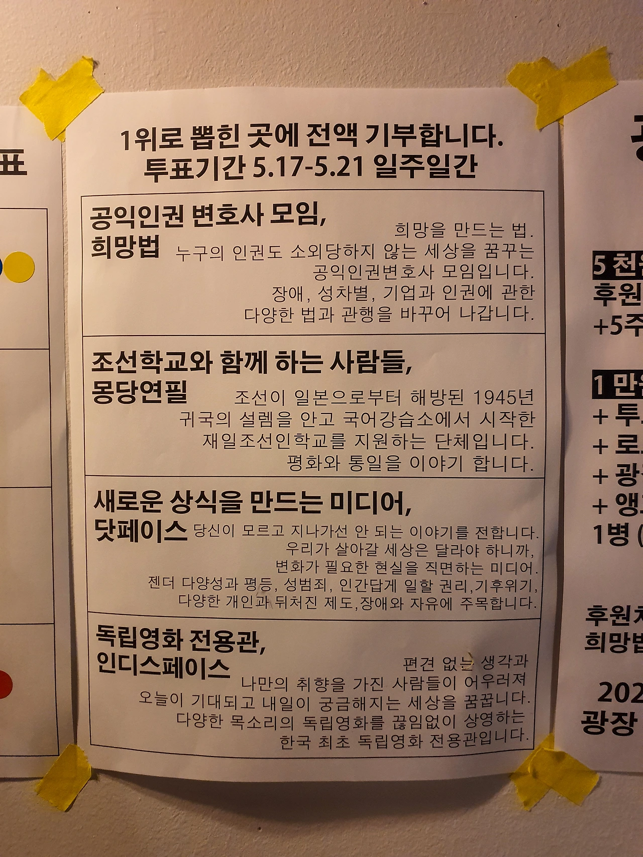 2021년 기부파티. 나는 <몽당연필>과 <인디스페이스>에 기부했고 비혼세 그립톡, 강쇠주 한 병이 당첨됐다. 최고다!