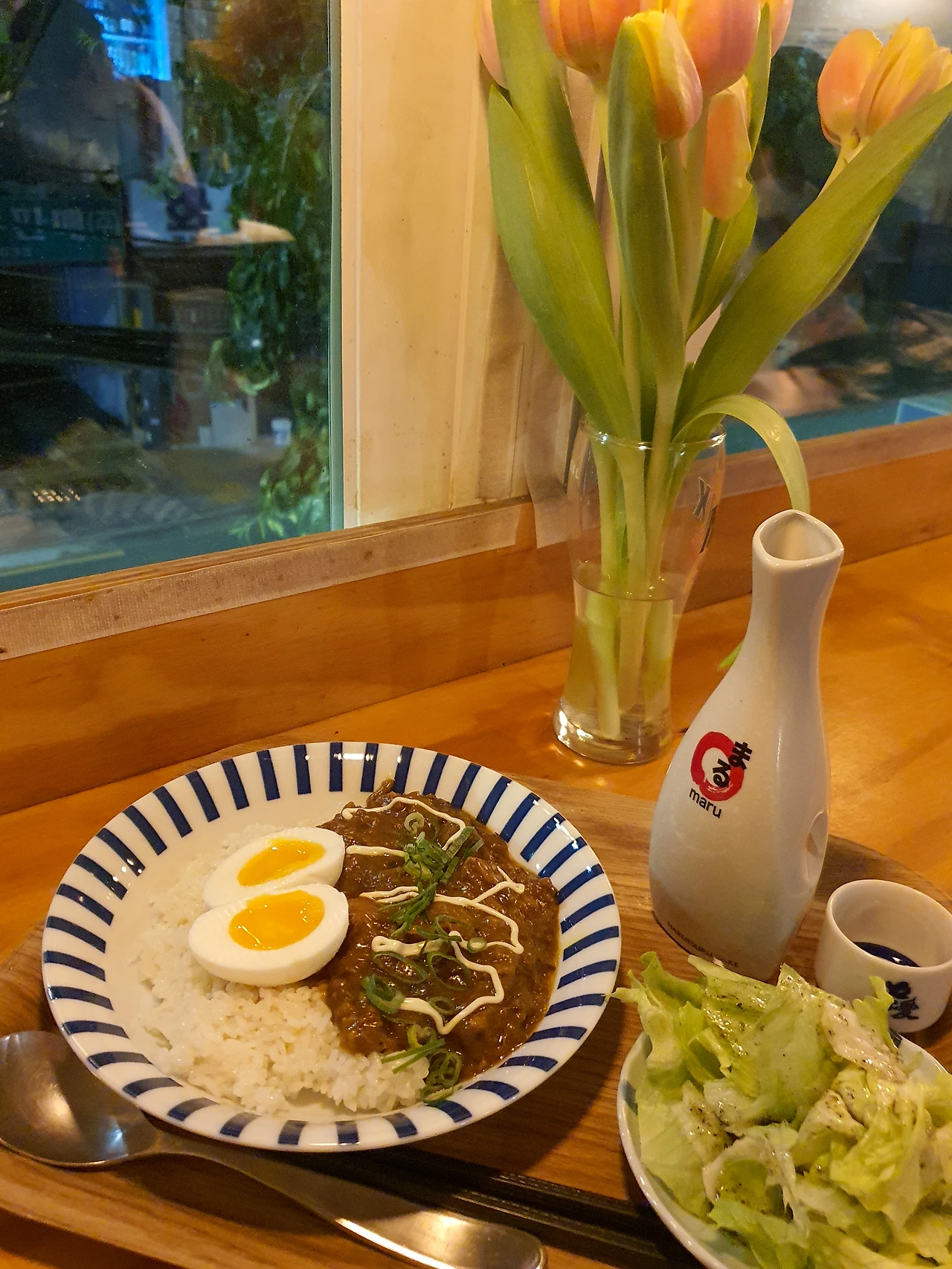 (왼) 베지누들수프와 강쇠주 (오) 소고기 카레와 따뜻한 사케
