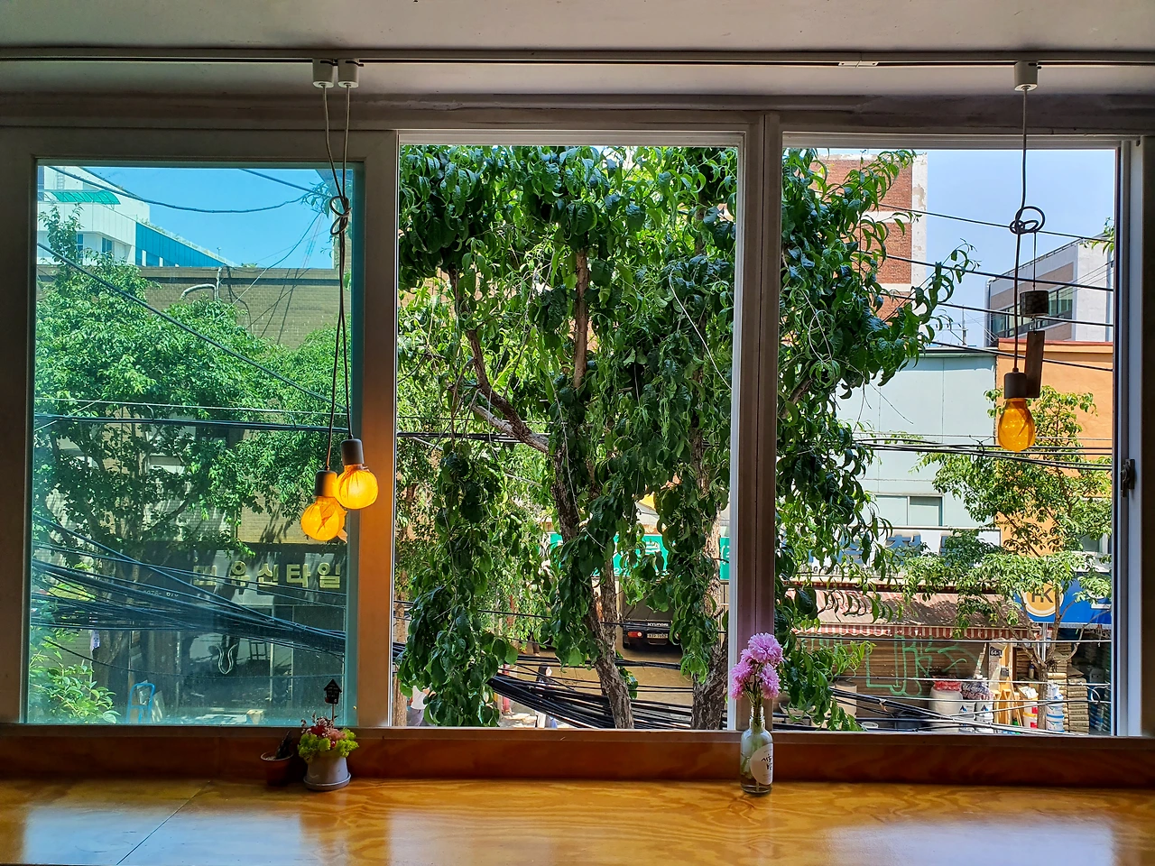 가게에 들어서서 왼쪽을 바라보면 큰 창과 그 바깥의 풍경이 반긴다. 여름에는 수목원이 따로 없다. 여름을 기준으로 밤 8시쯤이면 창밖 눈높이 살짝 아래의 가로등에 불이 켜진다.