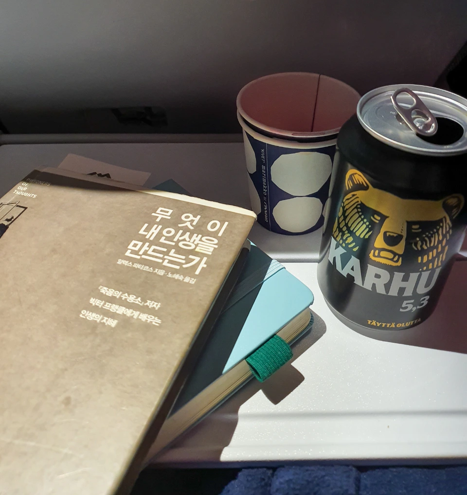 핀에어에 탑승했다. 맥주, 와인 야무지게 챙겨 먹었고 가져간 책을 읽었다. <죽음의 수용소>의 저자 빅터 프랭클의 철학을 토대로 알렉스 파타코스가 일의 의미에 대해 쓴 <무엇이 내 인생을 만드는가>에 푹 빠졌다. 비행기에 오르기 전 내 생활과 성찰은 비행기에 오른 뒤라 해서 접어둘 것이 아니었다. 이 여행은 그런 것이었다.