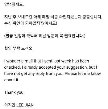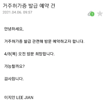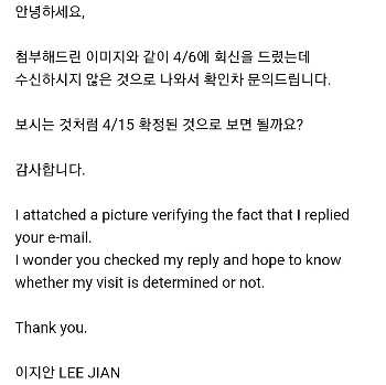 저렇게 보내고 나서는 따로 '일정 확정되었다'는 회신은 오지 않았습니다. 불안한 마음에 방문이 예정된 4월 15일의 이틀 전 저녁, 이렇게 메일을 한번 더 보냈습니다. (메일 주소를 잘못 쓴 것 같은 느낌에, 혹시나 해서 그 다음날 오전 같은 내용으로 한번 더..보냈습니다..ㅋㅋ 휴 그만큼 서류 준비에 신경 많이 쓰던 시기..)