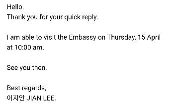 솔직히 말하면 2020년에 유학으로 출국하신 어떤 분의 블로그에서 '메일로 사전 예약 후 방문했다'는 표현을 미리 봤었고 대사관 홈페이지에도 저는 들어가봤습니다. 들어가기만 하고 자세히 안 살펴본 게 문제라면 문제였네요. '괜찮겠지, 가보지 뭐'라는 생각 탓에 저는 대사관을 한번 더 가야했습니다.
