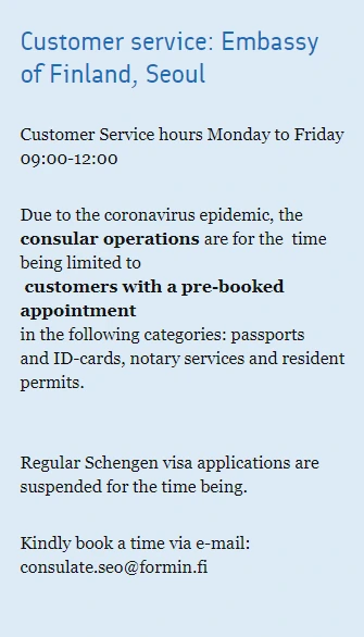 (현재 공개된 메일 주소는 consulate.seo@formin.fi 인데, 앞으로 바뀔 수도 있으니 사전 예약 전 아래 방법으로 메일 주소를 한번 더 확인해주시기 바랍니다.)