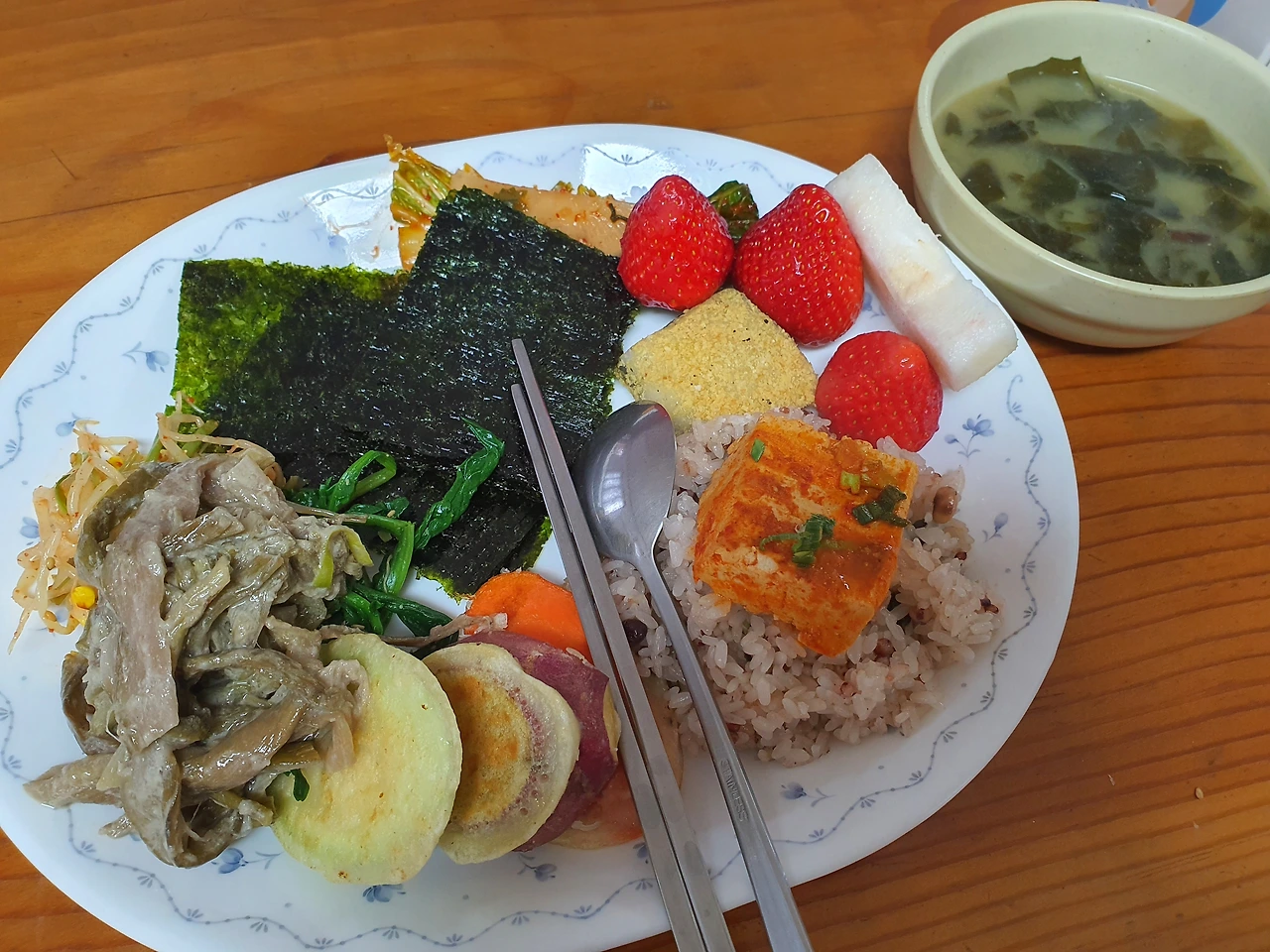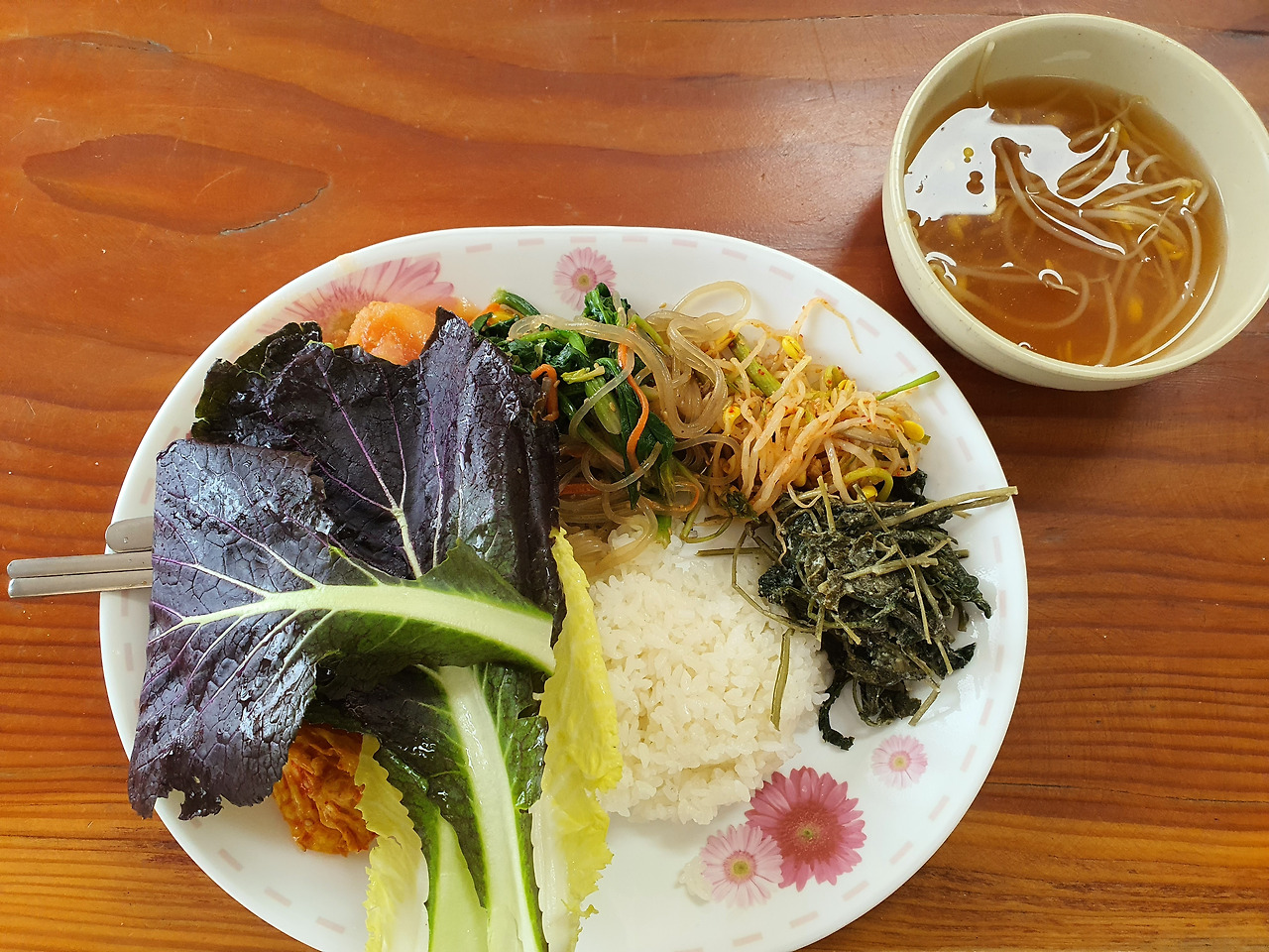절에서는 채식을 하게 된다. 완벽한 채식을. 맛이 없다는 생각은 할 틈도 없었다. 모든 찬과 밥, 국이 입맛에 맞았다. 후식으로 나오는 과일도 물론. 다음날 점심까지도 절 밥으로 해결하고 나오는 길이 그렇게 뿌듯할 수가 없었다. 2년 전에 왔을 때도 내가 이렇게 '행복한' 식사를 했었나?