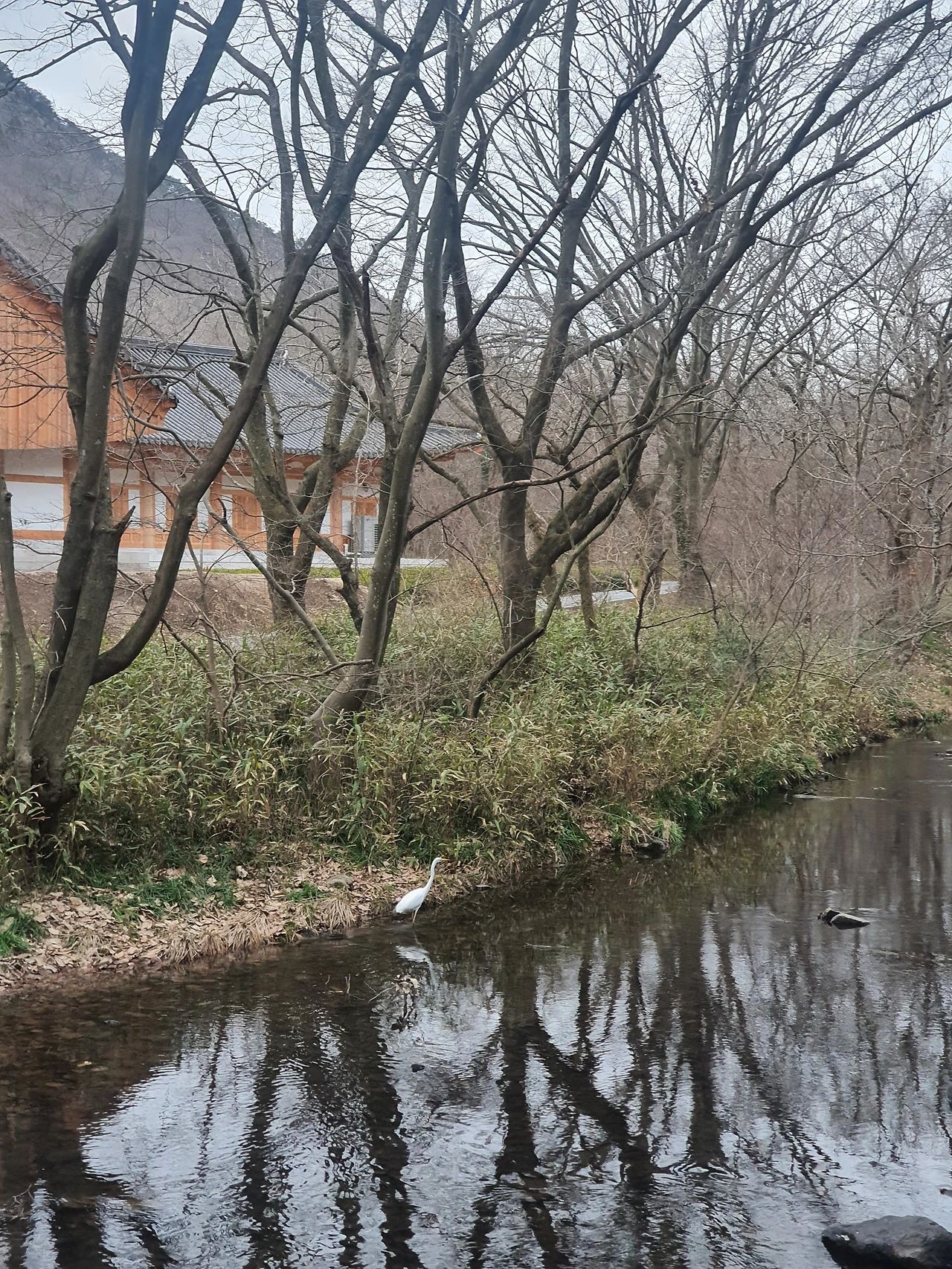 첫째날 저녁 공양 전 만난 고고한 황새. 둘이서 한참을 신기하게 바라봤다.
