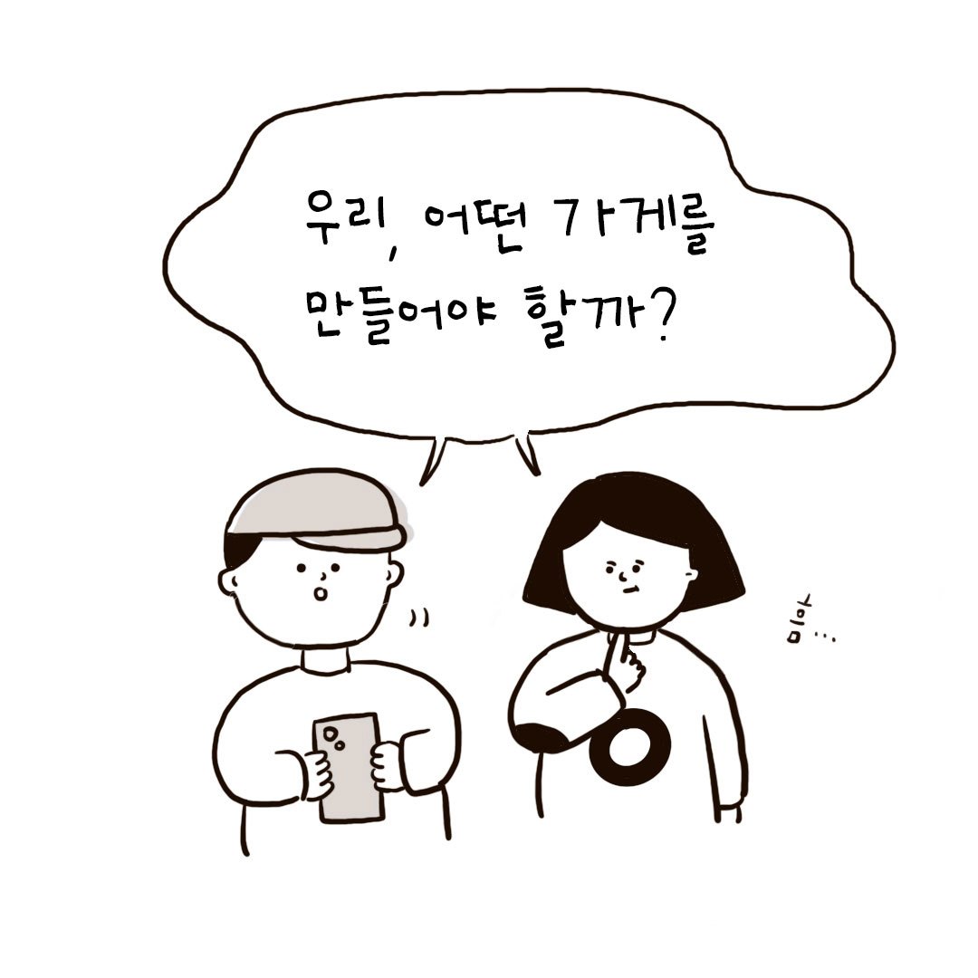 실제로 우리 둘다 핫플레이스보다는 유행을 너무 따라가지 않는 편안한 공간을 선호하거든요?! 우리가 만드려는 가게도 트렌드에 민감하게 움직이기보다는 천천히 가더라도 꾸준하게 살아남았으면 했어요. 그렇게 차곡차곡 이미지를 그려가며, 동시에 부동산도 열심히 알아보기 시작했답니다.