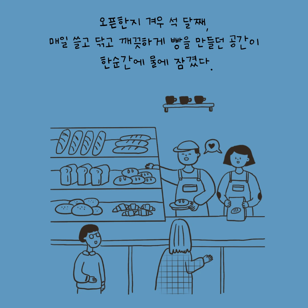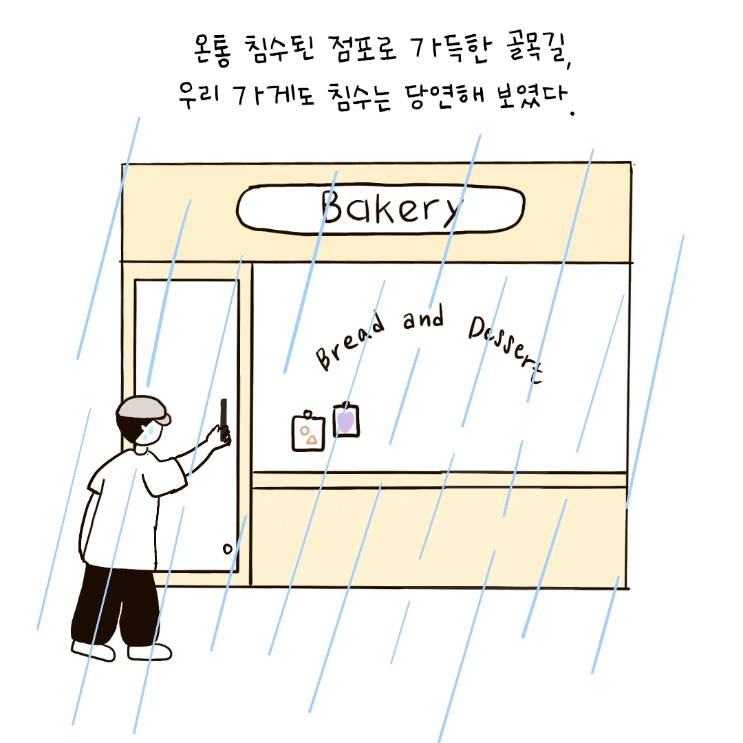 가게 문을 열자마자 흙탕물이 쏟아져나왔어요. 오픈한지 겨우 석 달째, 매일 쓸고 닦고 깨끗하게 빵을 만들어 팔던 공간이 한순간에 쓰레기장이 되어버렸어요. 남편의 전화를 받고 저도 곧장 가게로 향했습니다.