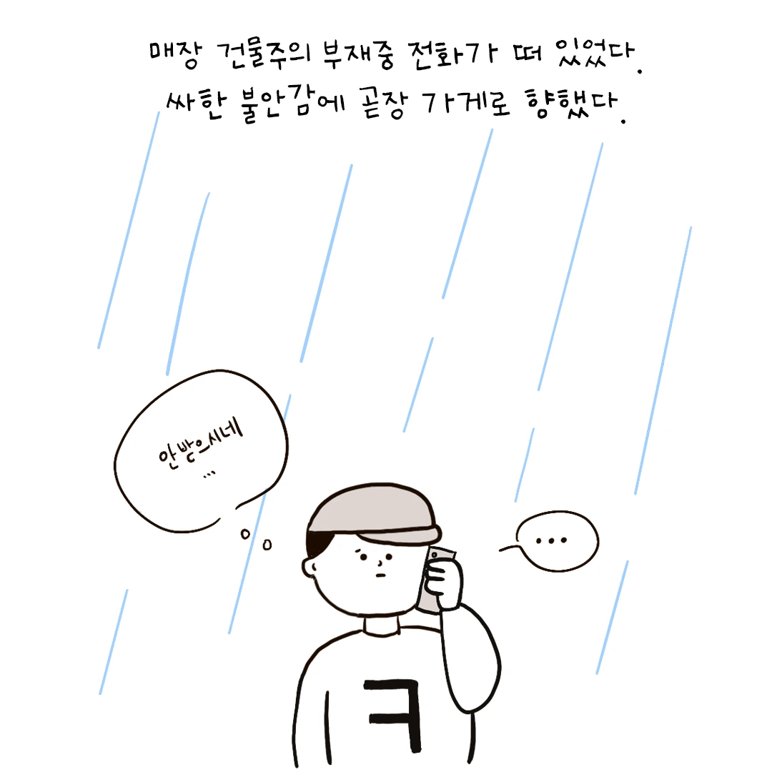 골목은 온통 물난리로 점포 상인들이 물을 빼느라 난리가 났었어요. 우리 매장도 침수된 게 당연해 보였습니다.