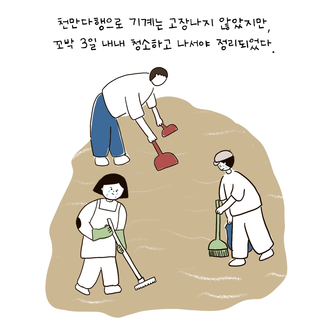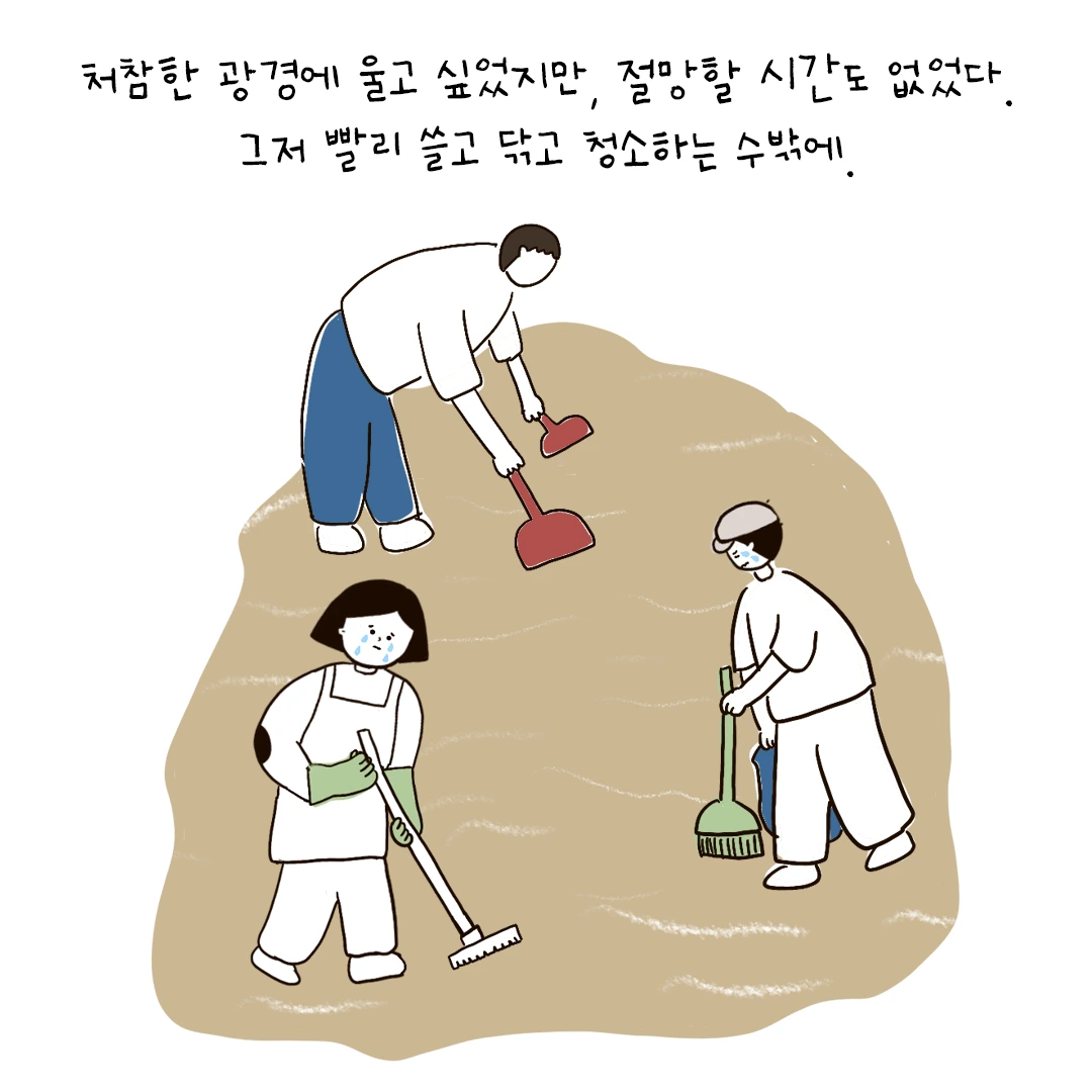 처참한 가게를 보고 정말 울고 싶었지만, 절망할 시간도 없었어요. 그저 빨리 쓸고 닦고 청소하는 수밖에요. 기계가 망가지지 않았나 체크해야 하고, 물에 잠긴 각종 물건과 가전제품들을 쓰레기봉투에 담아 바로 버리고, 청소하는 일이요.