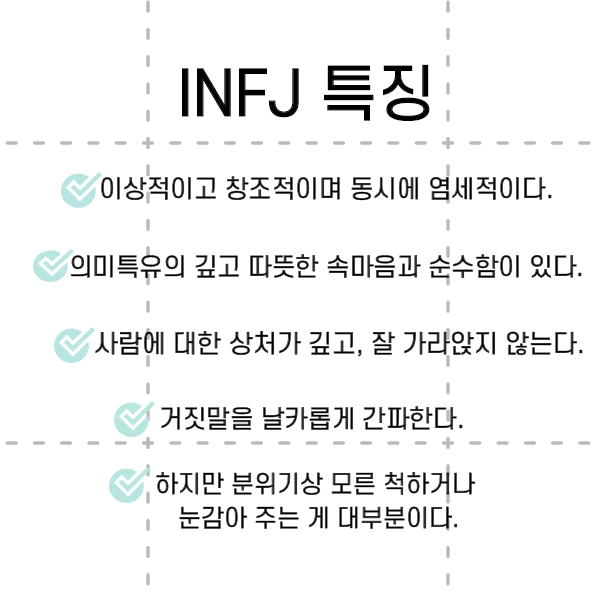 INFJ가 이러한 특성들을 가지게 된 건 아마 예민하고 섬세한 사람이라 주변의 모든 것들을 잘 이해하고 캐치를 잘하는 성향으로 더 발달된 거라는 생각이 든다.