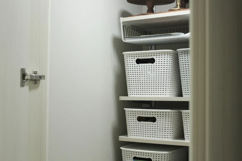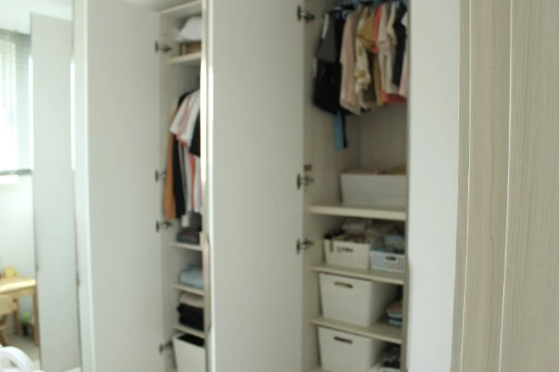 비바람이 부는 날이 아니고서는 매일 옷장 문을 열어 환기를 시키는 편이다. 옷장 틈새로도 생활 속 냄새가 스며들 테니 깨끗한 공기를 통하게 하는 환기가 필요하다. 계절 옷은 손이 잘 닿는 앞쪽에 걸어두고 구멍이 있는 바구니를 활용하면 정리가 편하다. 큰 바구니는 바지, 니트, 티셔츠, 모자 등을 담는다. 낮은 바구니는 아이 내복, 양말, 속옷, 손수건 등 작은 옷가지를 담기에 좋다. 바구니 뚜껑 사용은 보관 상태에 따라 매일 꺼내 입는 옷은 오픈된 상태로 두고 자주 꺼내 입지 않는 보관용 옷만 덮어둔다. 비 오고 습도가 아주 높은 날에는 옷이 상하지 않게 곰팡이 피지 않게 제습기를 틀어서 관리하고 있다.