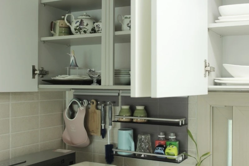 매일 먹고 씻고 말려서 그릇을 쌓아두는 싱크대. 그런데 아무리 설거지를 해도 그릇에는 음식 냄새가 미세하게 남게 되고 싱크대 안에도 퍼지게 된다. 특히 양념류를 넣어두는 곳과 환풍기 바로 옆에 붙은 공간은 냄새가 더 많이 날 수밖에 없다. 문 활짝 열어 냄새도 빼고 단정하게 쌓여있는 그릇 한번 쳐다보면서 커피 한 잔 마시는 여유도 꽤 행복하다. 너무 오래 열어두면 또 외부 먼지가 들어갈 테니 적당히 환기시키고 문을 닫는다.