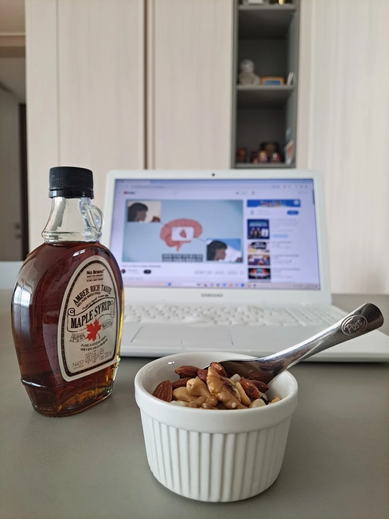 오늘도 출출함에 무심코 머그잔을 집어 들었다가 다시 내려 둔다. 커피를 줄이고 종일 맹물로만 배 채우자는 게 아니니 대신 요거트와 견과류를 꺼냈다. 얼마 전 마트에서 산 메이플 시럽도 살짝 뿌렸다. 달달하고 건강하게 씹히는 맛이 커피향만큼이나 기분을 좋게 한다.