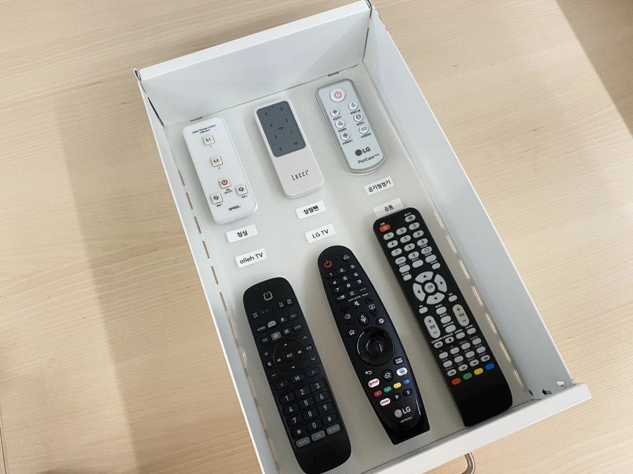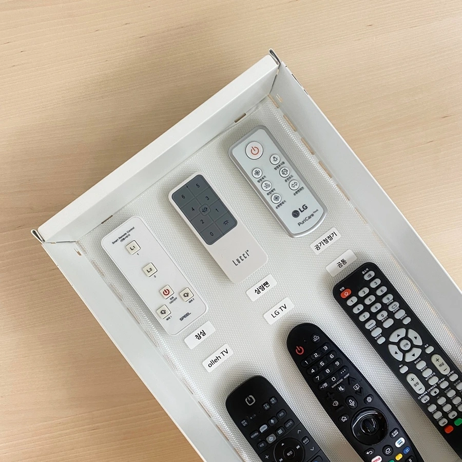 보이지 않게 비노출로 수납하고 누구나 알아보기 쉽도록 이름을 달아 리모컨을 정리하기로 했다.