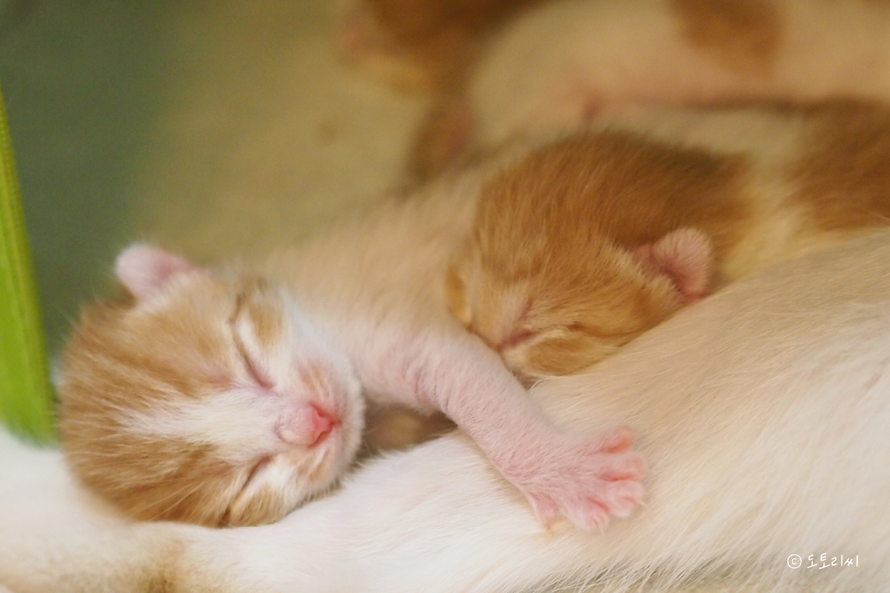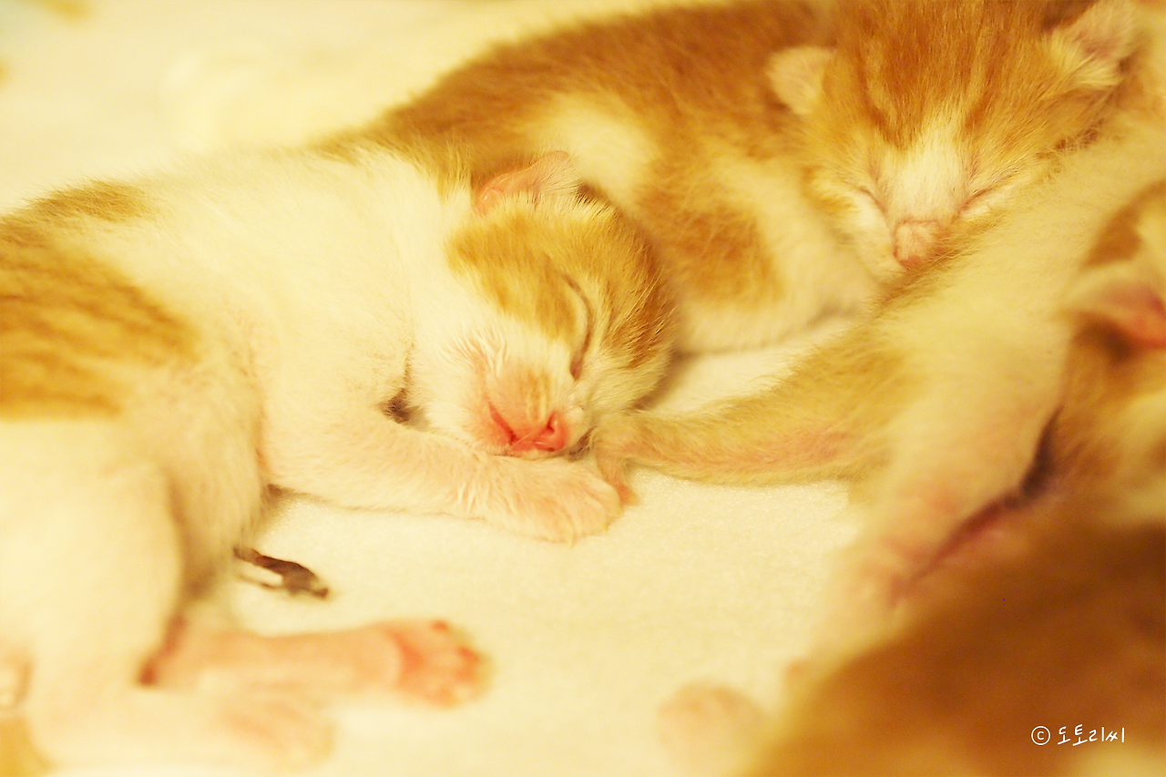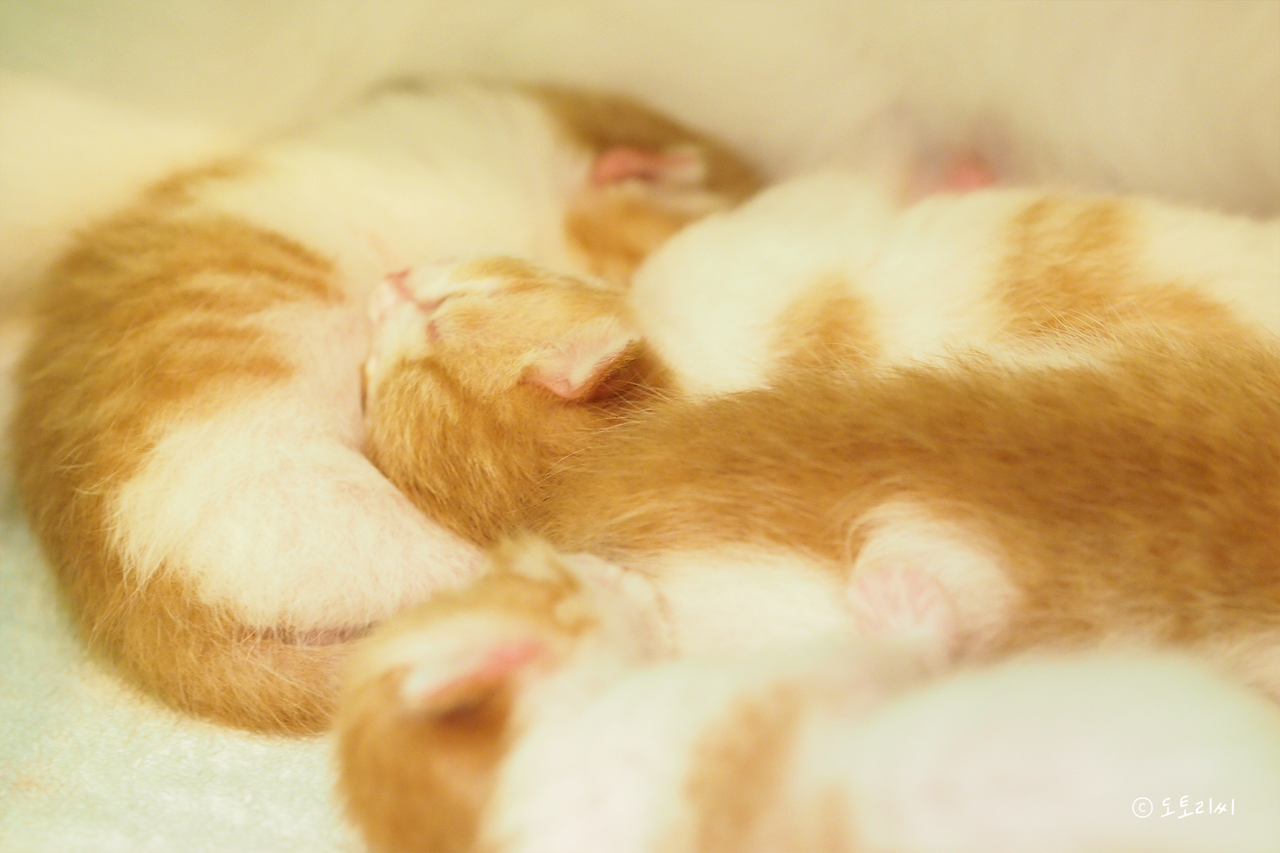 그리고 어느 날부터 노랑이의 예쁜 새끼 고양이 네 마리는 곧 눈을 떴고, 뽈뽈 방 안을 기어 다녔다. 우리는 이 생물들의 케어를 위한 구분이 필요했고, 그 도구로 '이름'이라는 것이 필요해졌다. 아. 그래서였다.