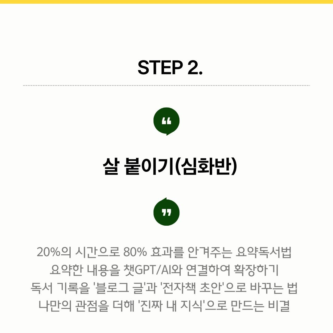 Step 3. 3줄 요약 및 구조화 (내재화) 한 챕터를 다 읽었다면 책을 덮고 허공을 보라. 그리고 방금 읽은 내용을 3줄로 요약해 보라. 기억나지 않는다면 다시 펴서 확인한다. 그리고 이 요약본을 스마트폰 메모장이나 노트에 기록한다. 이때 문장은 저자의 것이 아닌 '나의 말투'여야 한다.