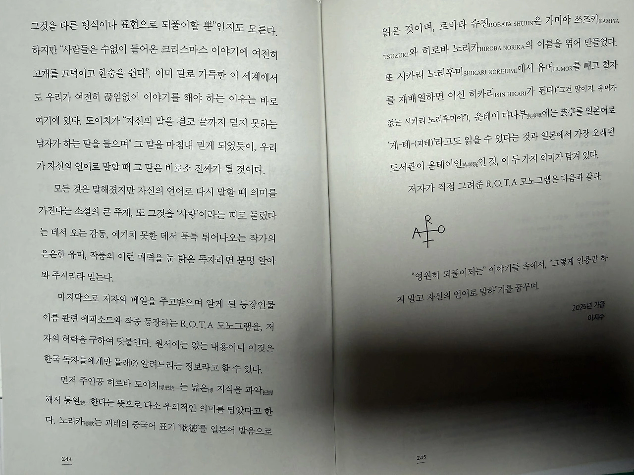 모든 것은 말해졌지만 자신의 언어로 다시 말할 때 의미를 가진다는 소설의 큰 주제, 또 그것을 '사랑'이라는 띠로 둘렀다는 데서 오는 감동, 예기치 못한 데서 툭툭 튀어나오는 작가의 은은한 유머, 작품의 이런 매력을 눈 밝은 독자라면 분명 알아봐 주시리라 믿는다.