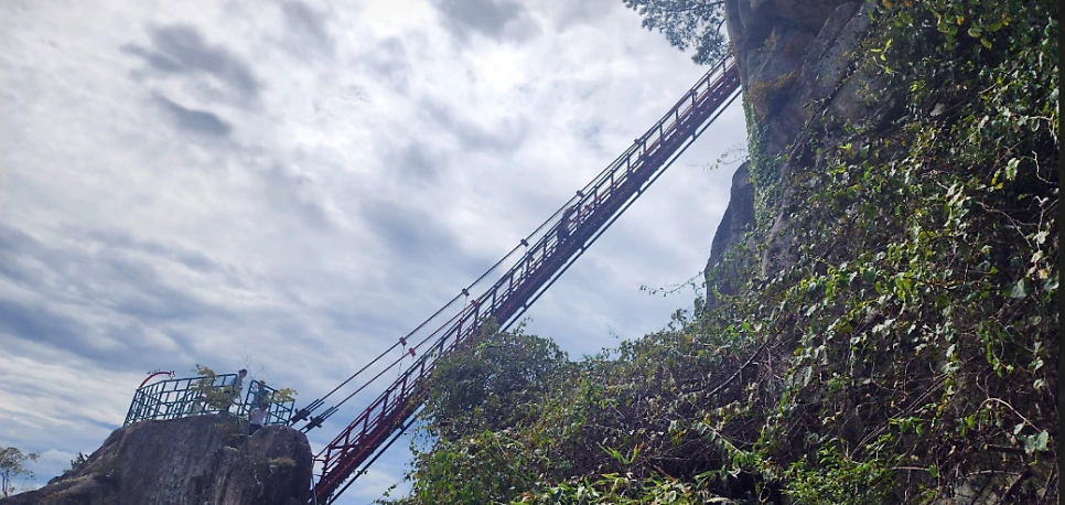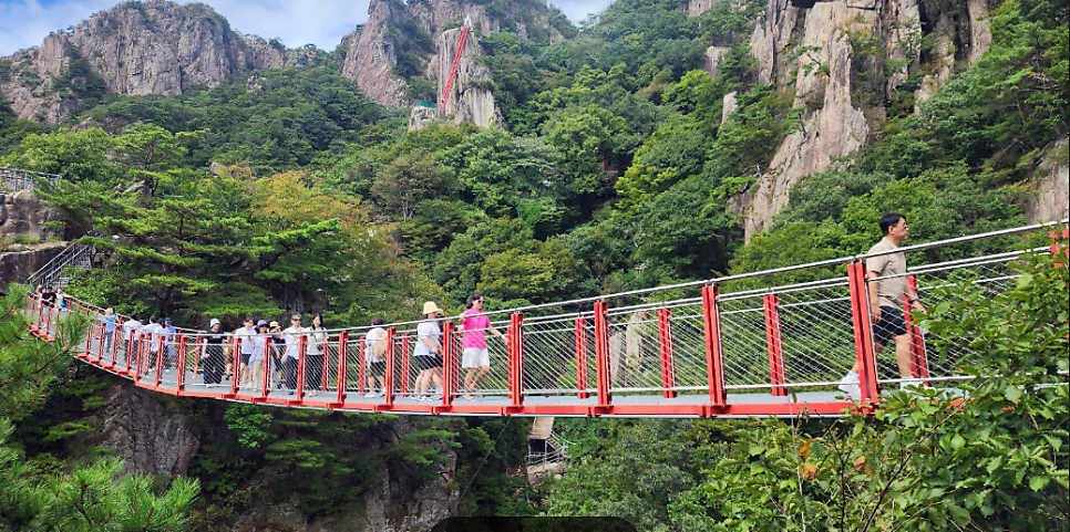 저는 친구의 티셔츠 끝자락을 한 주먹 움켜쥐고 천천히 앞을 보며 걸어갔습니다. 흔들 다리 끝에 도착해서 뒤를 돌아보았습니다. 내가 저 길을 어떻게 걸어왔을까. 묘한 감정이 들었습니다. 흔들 다리를 한 개를 건너고 다시 정상을 향해서 걸었습니다. 이번에는 경사가 50도라는 정상 고바위 다리 앞에 섰습니다. 다리가 후들후들 떨렸습니다.