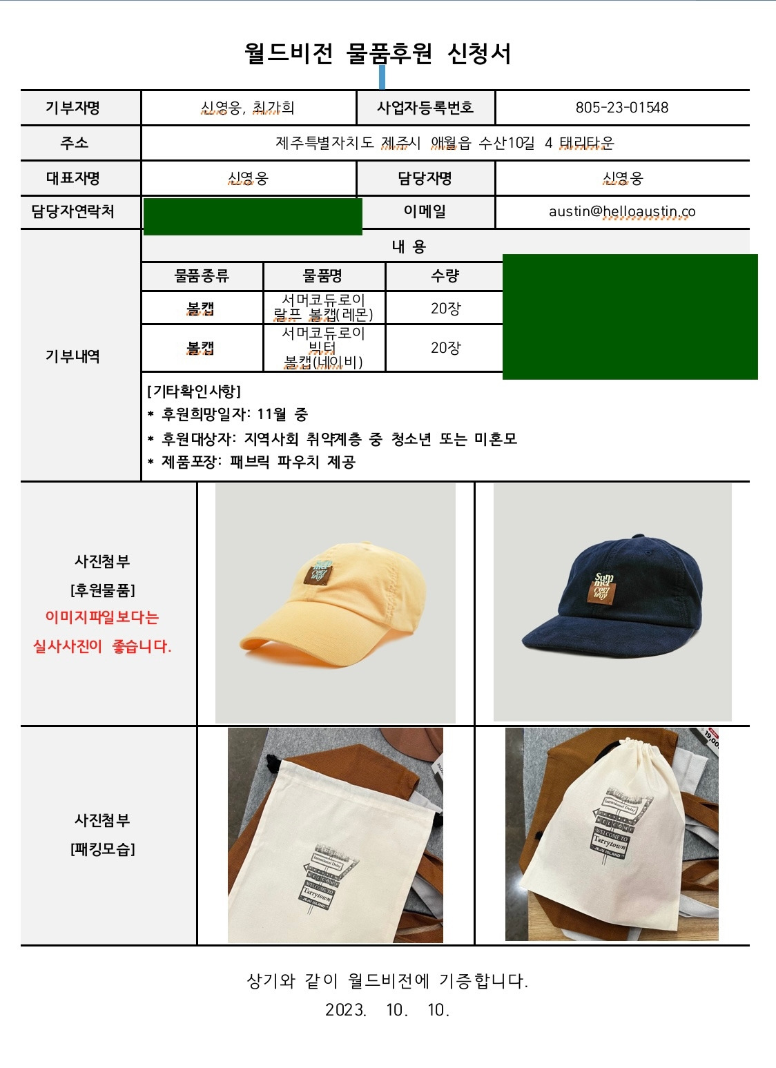 지난 번 기부처를 찾는다는 요청에 많은 곳에서 연락이 오셨는데요.(모두 감사합니다!) 가장 먼저 연락을 주신 월드비전에 신청서를 드렸습니다.