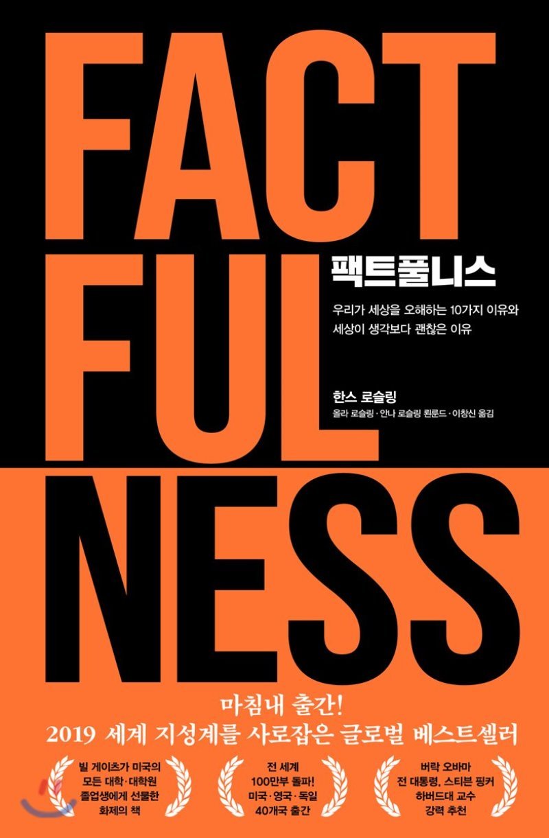 우리말로 '사실충실성'이라 번역된 팩트풀니스Factfulness는 읽는 내내 내게 절망과 희망을 동시에 선사했다. 우선 내가 세상을 얼마나 띄엄띄엄, 그것도 굉장히 편협하게 인식하고 있었는가를 깨닫게 해 주었다. 그러면서 동시에 내가 사는 이 커뮤니티가 그래도 (-)의 방향이 아닌 (+)의 방향으로 가고 있다는 사실도 동시에 알려주었다. 그것의 속도나 구체적인 방향에 대해서는 논의해야 할 부분이 많지만 막연히 우리 사회가 (-)의 방향으로 가고 있을 것이라는 생각을 하고 있었던 내게는 그나마 잠깐 한숨을 돌리게 해주는 계기가 됐다.