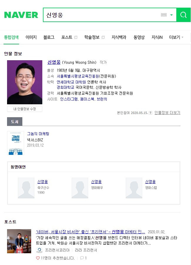 네이버를 퇴사하면서 세운 작은 목표(과정이라고 하는 게 보다 정확할 듯)가 몇 개 있다. 그 중 하나가 내가 지금 떠나는 이 곳에 내 이름을 검색했을 때 나오는 사람이 되는 것. 그래야 퇴사라는 선택이 후회되지 않을 거라 생각했다.
