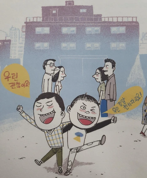 싸움구경 삽화 중 어른 싸움이 되었던 우리 아이의 싸움은 한참이 지나서야 "우리는 괜찮아요" 할 수 있었다. 진짜 아이들은 돌아서서 어린이집 사진에서 함께 즐겁게 웃고 있었는데 정작 나는 그러지 못했다. 시우와 유민이의 "우리는 단짝 친구니까요"까지는 아직 되지 못했지만 어쩌면 다시금 말할 수 있는 날이 올 수도 있겠지?